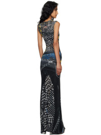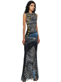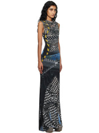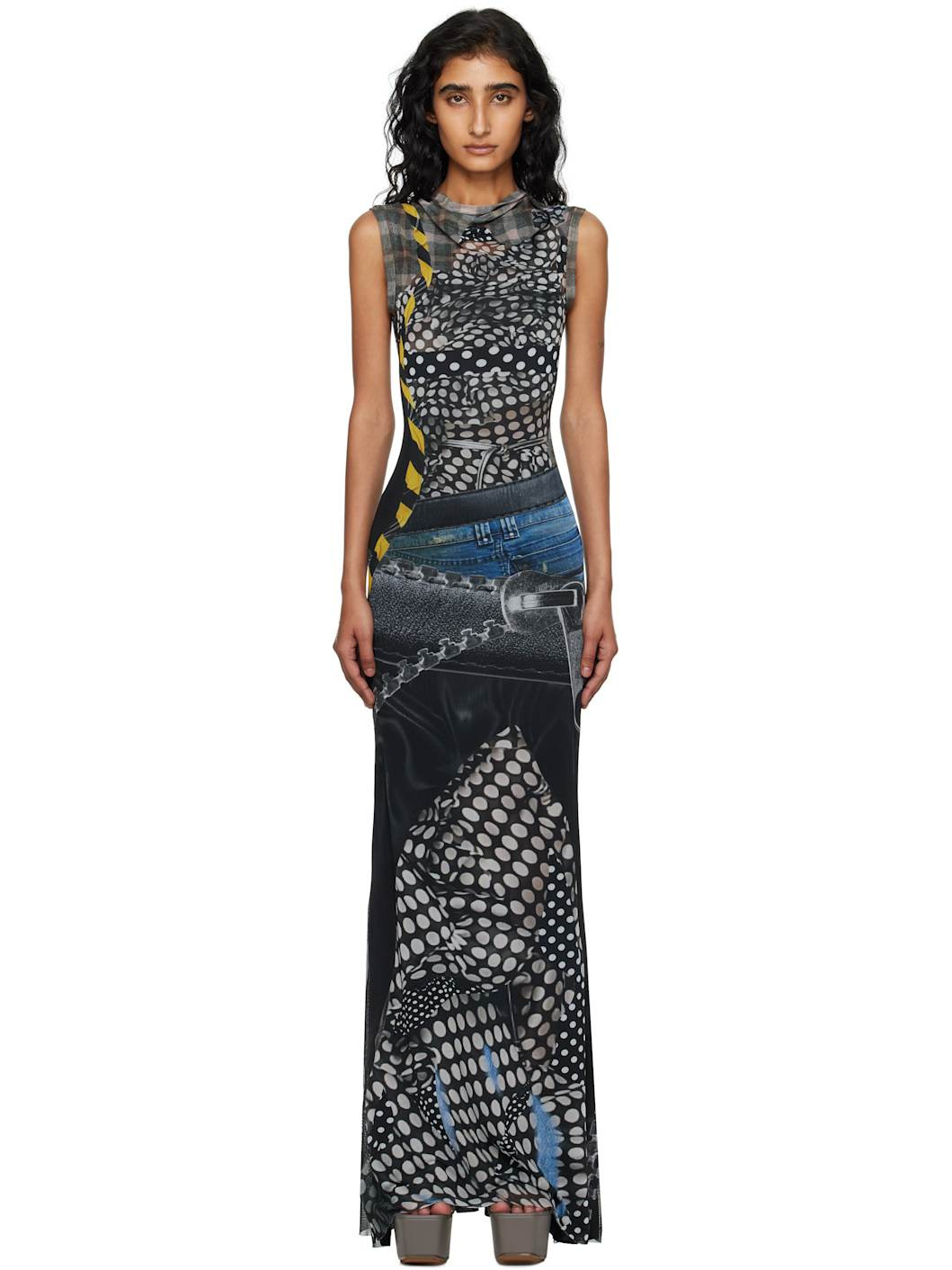 Sheer stretch recycled polyester mesh maxi dress. · Graphic pattern printed throughout · Boatneck · Raw edge at hem · Full jersey lining Supplier color: Polka dot zip print Body: 90% recycled polyester, 10% elastane. Lining: 84% polyamide, 16% elastane. Made in Greece 252016F055004