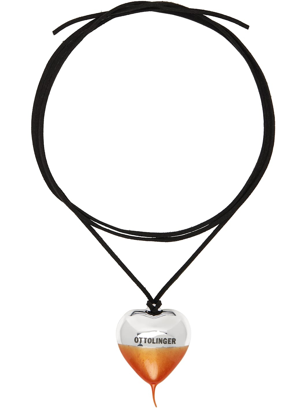 Wraparound suede necklace in black. · Orange rubberized coating at logo-engraved graphic pendant · Self-tie fastening · L56" Each item is unique. Please note finishings may vary. Supplier color: Silver/Tangerine Leather, metal, rubber. Made in Greece 251016M145000