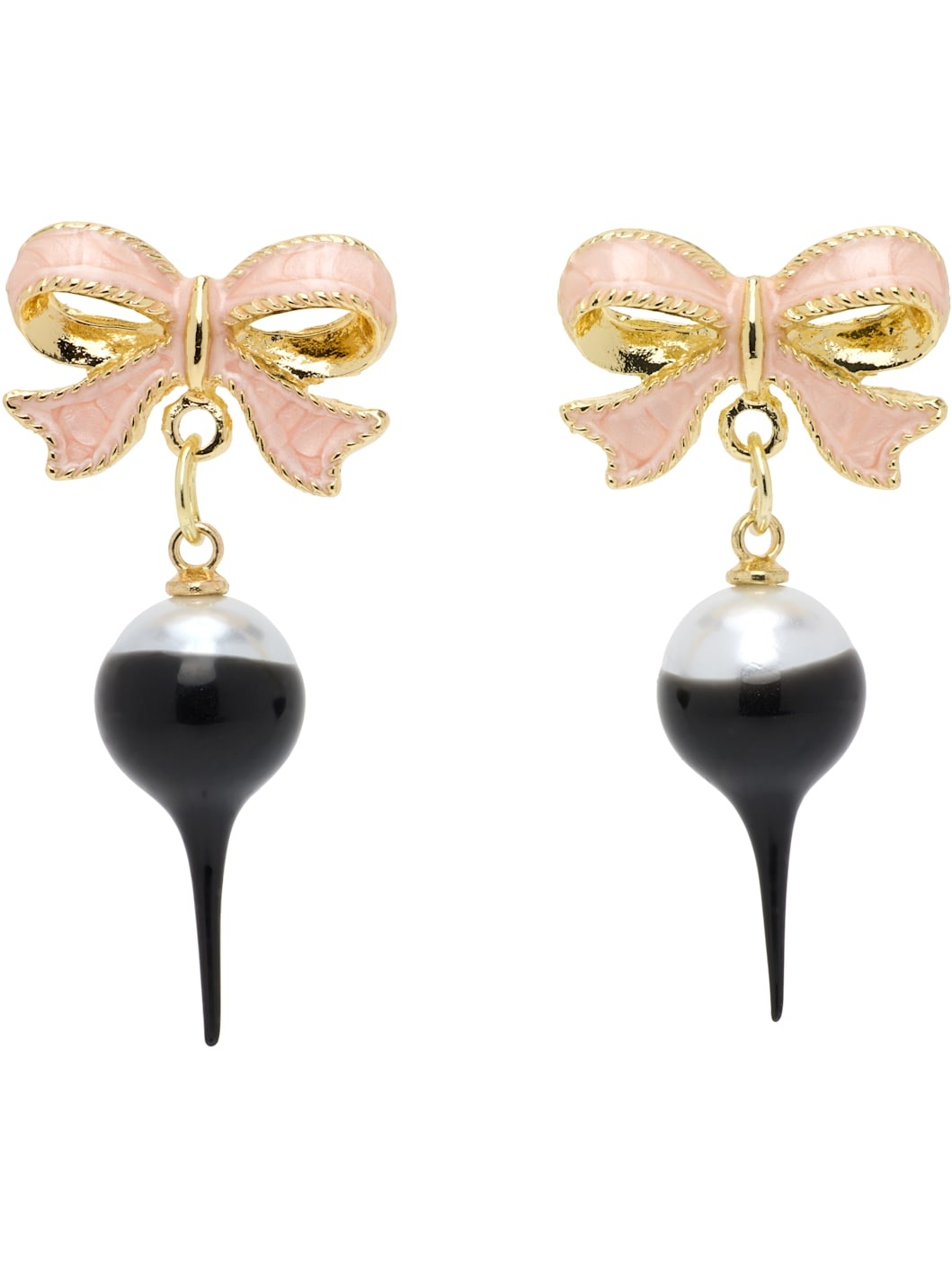 Pair of handcrafted drop earrings in gold tone. · Bow hardware with pink enamel at face · Black rubberized coating at faux-pearl charm · Post-stud fastening · H1.5" x W0.75" Each item is unique. Please note that finishings may vary. Supplier color: Gold/Pink Metal. Made in Greece 242016F022006