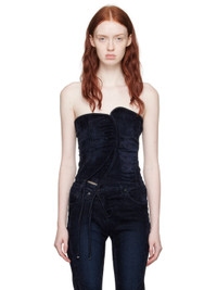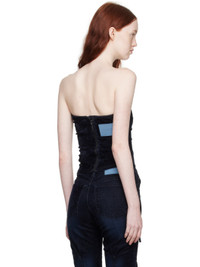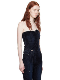 Handcrafted stretch flocked denim corset-style tank top. Piping throughout. · Asymmetrical construction · Sweetheart neck · Concealed zip vent and extended trim at hem · Zip closure and rubberized logo patch at back Each item is unique. Please note coloration and finishings may vary. Supplier color: Midnite blue 90% cotton, 8% reused cotton, 2% elastane. Made in Turkey 232016F111004