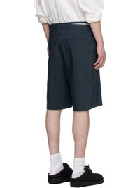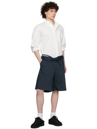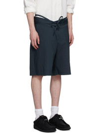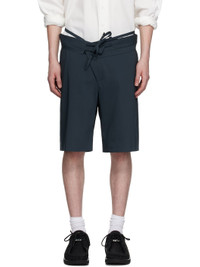 Plain-woven stretch cotton-blend shorts. · Belt-style strap and raw edges at layered waistband · Drawstring at foldover waistband · Three-pocket styling · Offset zip fly Supplier color: Dark blue Body: 62% cotton, 33% polyester, 5% elastane. Lining: 94% polyester, 6% elastane. Made in Poland 251016M193006