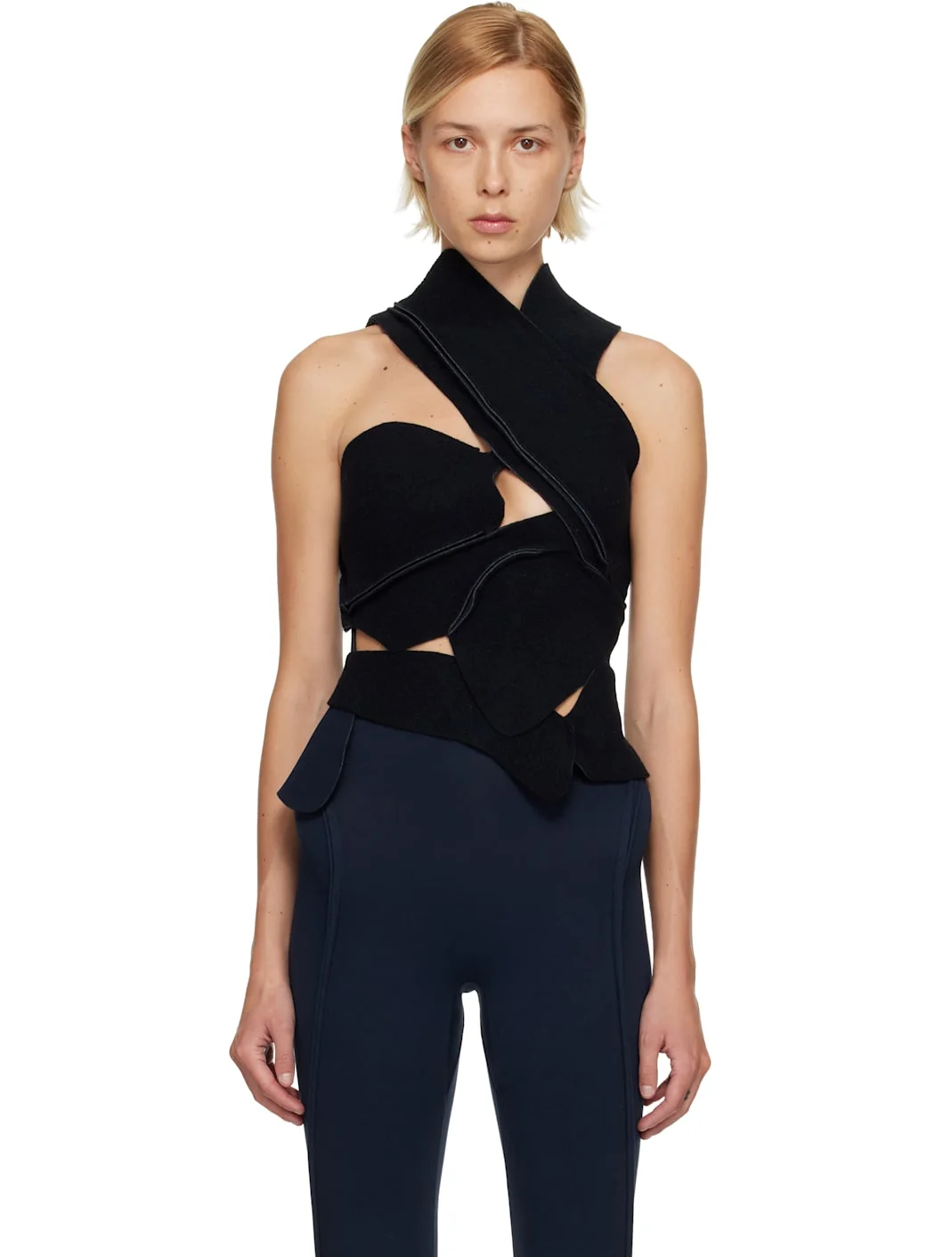 Stretch felted neoprene top. · Asymmetrical paneled construction · Raw edges throughout · V-neck · Cutouts at front Supplier color: Dark navy 60% polyester, 25% acrylic, 12% virgin wool, 3% elastane. Made in Greece 252016F111003