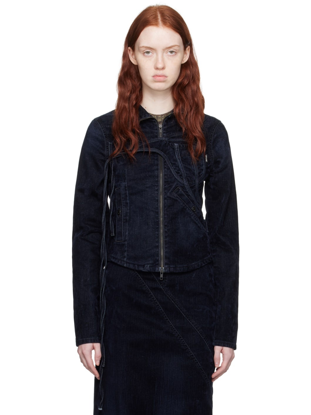 Handcrafted stretch flocked denim jacket. Self-tie drawstring and locker loops at front for alternate styling. · Convertible spread collar · Two-way zip closure extends to collar · Logo flag at chest · Patch and welt pockets · Curved hem · Zip vent at cuffs · Rubberized logo patch at back yoke · Logo-engraved black hardware Each item is unique. Please note coloration and finishings may vary. Supplier color: Midnight 90% cotton, 8% reused cotton, 2% elastane. Made in Turkey 232016F060008