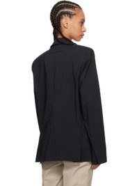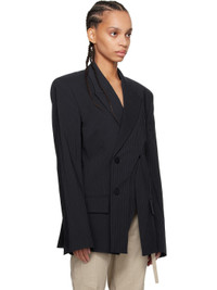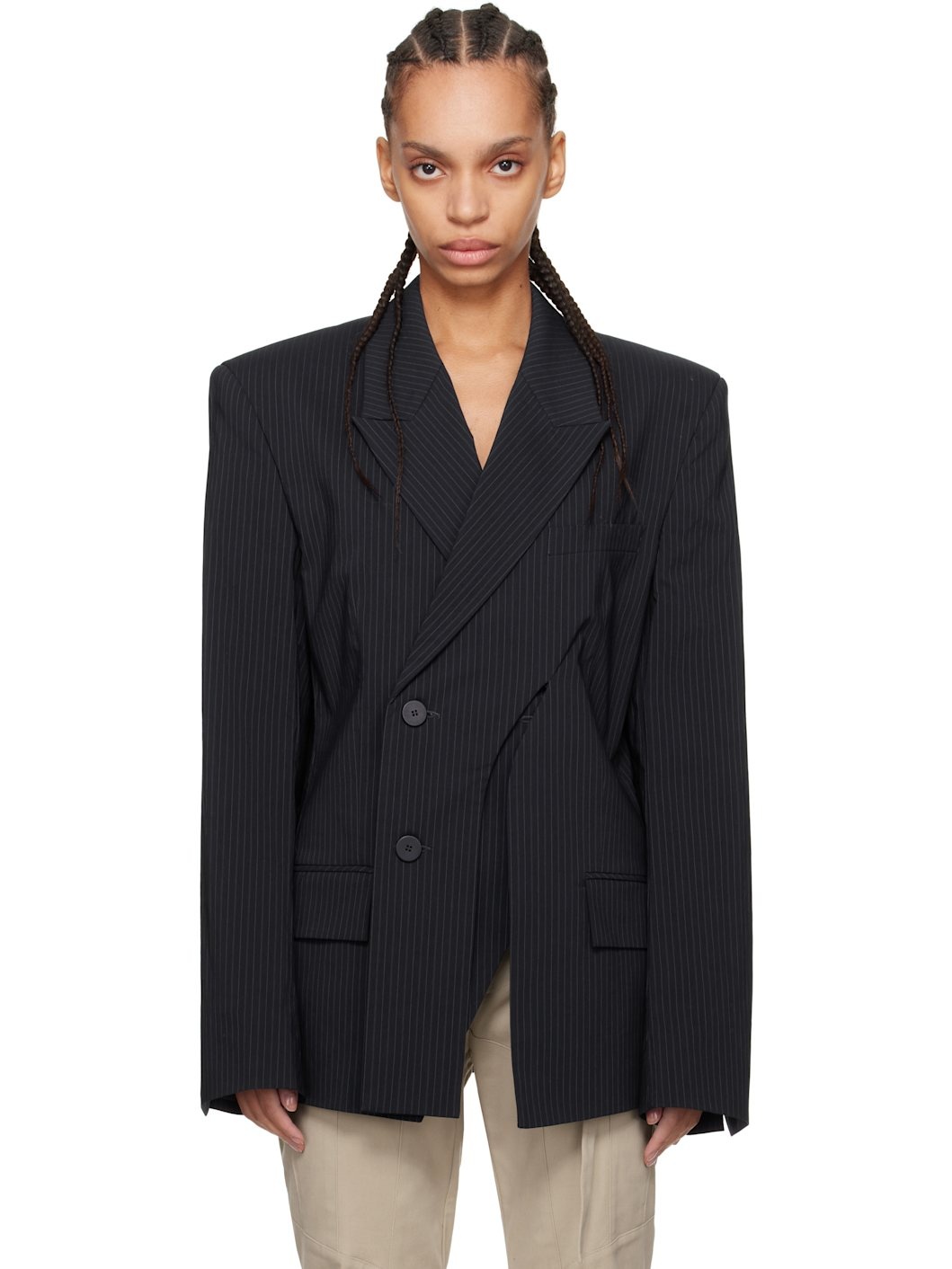Stretch cotton- and nylon-blend twill blazer. Pinstripes throughout. · Peaked lapel · Button closure · Welt pocket at chest · Curved slit at front · Flap pockets at waist · Padded shoulders · Vent at cuffs · Twin vents at back hem · Welt pocket at interior · Full satin lining Supplier color: Navy striped Body: 52% cotton, 41% polyamide, 3% polyester, 4% elastane. Lining: 94% polyester, 6% elastane. Made in Poland 251016F057002