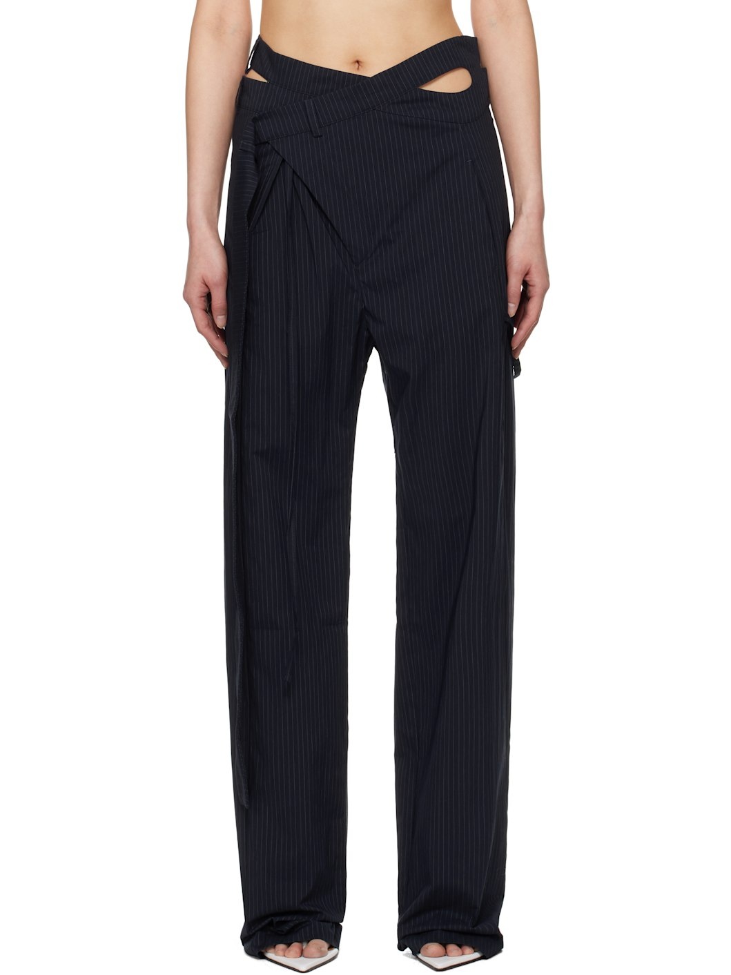Stretch plain-woven cotton-blend trousers. Pinstripes throughout. · Asymmetrical wrap construction · Belt loops · Self-tie straps and cutouts at waistband · Three-pocket styling · Offset zip fly · Straps at interior cuffs for alternate styling · Partial satin lining Supplier color: Navy striped Body: 52% cotton, 41% polyamide, 4% elastane, 3% polyester. Lining: 100% polyester. Made in Greece 251016F087008