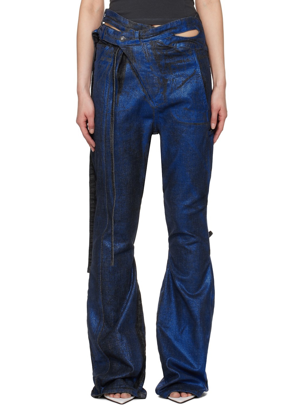 Stretch denim jeans. Faded metallic coating throughout. · Asymmetrical construction · Belt loops · Extended trim and cutouts at waistband · Five-pocket styling · Offset button fly · Rubberized logo patch at back waistband · Logo flag at back pocket · Self tie straps at back legs · Logo-engraved gunmetal-tone hardware Available exclusively at SSENSE. Supplier color: Black/Blue metallic 98% cotton, 2% elastane. Made in Turkey 251016F069001