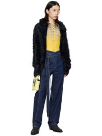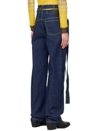 Stretch cotton-blend denim jeans. Belt loops, cutout, and extended belt straps at modified waistband. · Wrap construction · Five-pocket styling · Offset button-fly · Rubberized logo patch at back waistband · Contrast stitching in yellow Wholesale exclusivity at SSENSE. Supplier color: Deep blue 63% cotton, 30% recycled cotton, 6% recycled polyester, 1% elastane. Made in Turkey 241016M186007