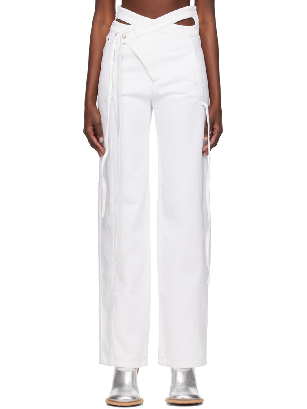 Handcrafted straight-leg stretch denim jeans. · Belt loops and cutouts at asymmetric waistband · Five-pocket styling · Offset button-fly · Self-tie straps at waist · Rubberized logo patch at back waistband · Logo flag at back Wholesale exclusivity at SSENSE. Supplier color: White 81% cotton, 14% reused cotton, 4% recycled polyester, 1% elastane. Made in Turkey 241016F069007