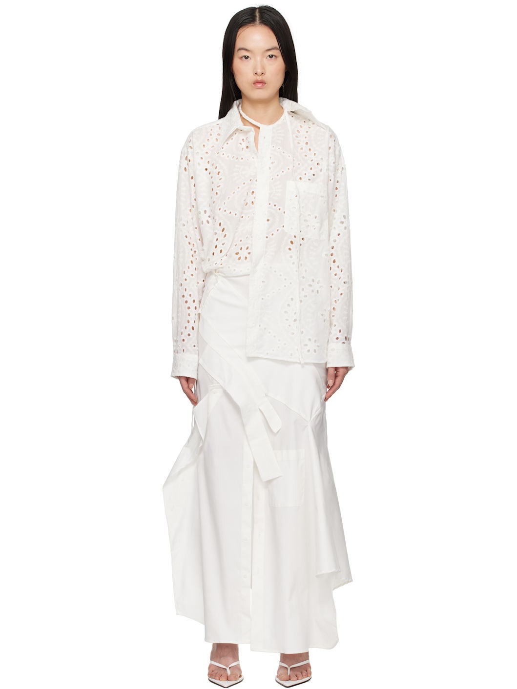 Stretch polyester- and cotton-blend broderie anglaise and poplin midi dress. · Asymmetrical paneled construction · Self-tie strap at modified spread collar · Button closure front · Button fastening and self-tie straps at waist · Button vents at hem · Buttoned barrel cuffs · Ruching and extended trim at back Supplier color: White 58% polyester, 40% cotton, 2% elastane. Made in Greece 251016F054001