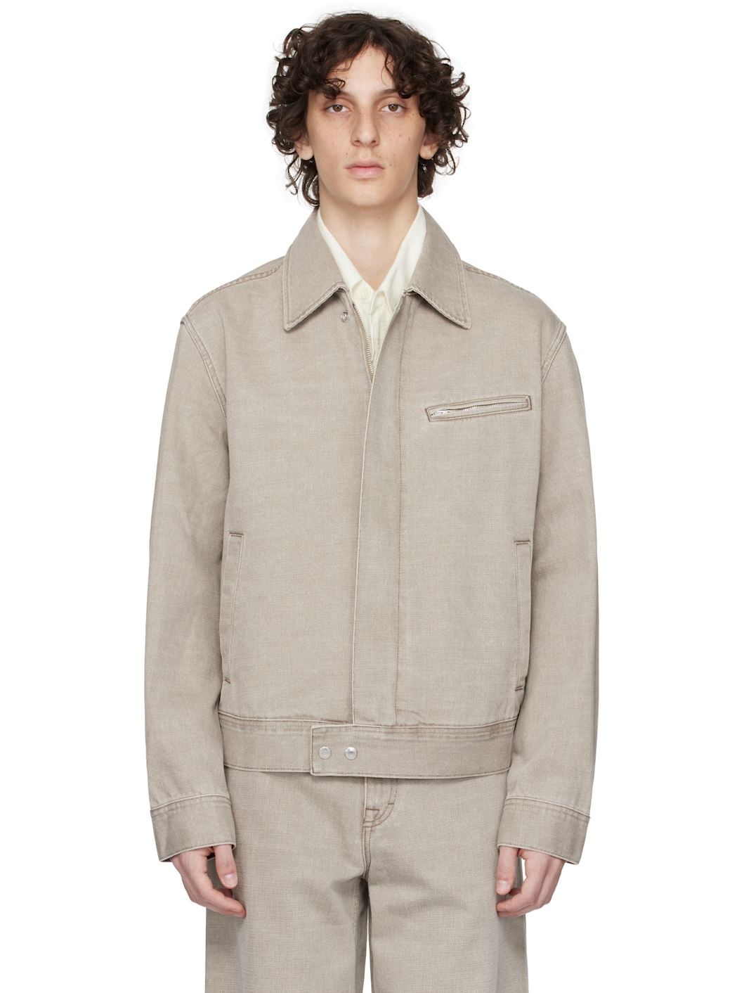 Pigment-dyed non-stretch denim jacket. Subtle fading throughout. · Spread collar · Two-way zip closure · Welt pockets at front · Adjustable press-stud tab at front hem · Buttoned barrel cuffs · Adjustable button tabs at back hem · Logo-engraved silver-tone hardware · Contrast stitching in brown Supplier color: Vienna beige wash 100% cotton. Made in Portugal 252803M177000