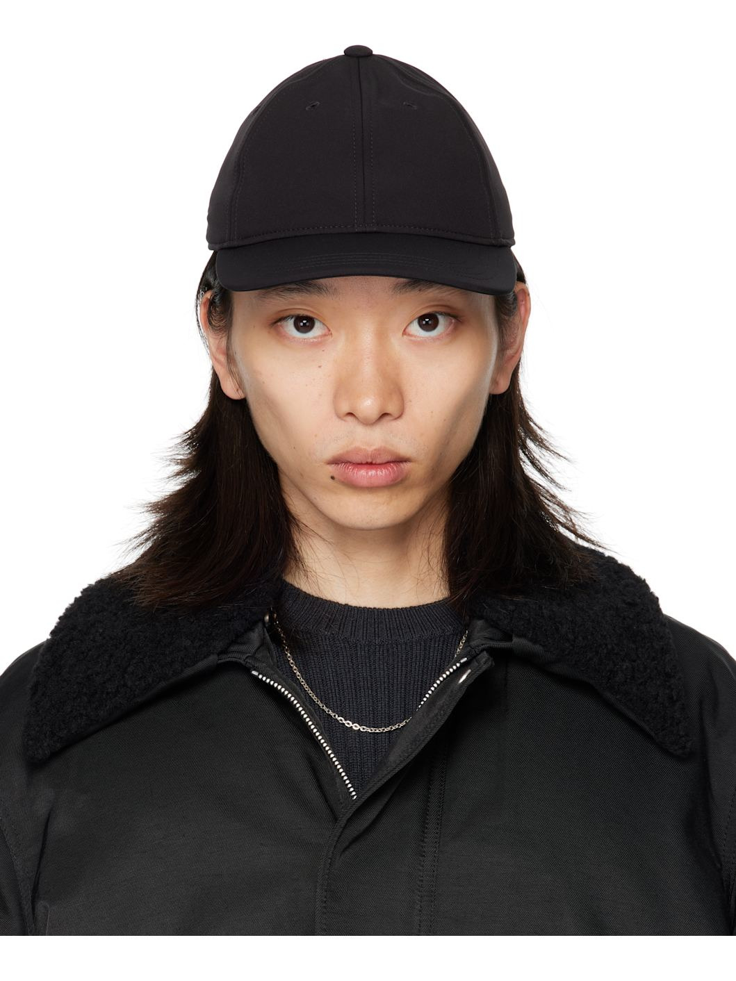 Stretch nylon taffeta cap. · Embroidered eyelets at crown · Curved brim · Cinch fastening Supplier color: Pitch black muted scuba 88% polyamide, 12% elastane. Made in Portugal 252803M139001