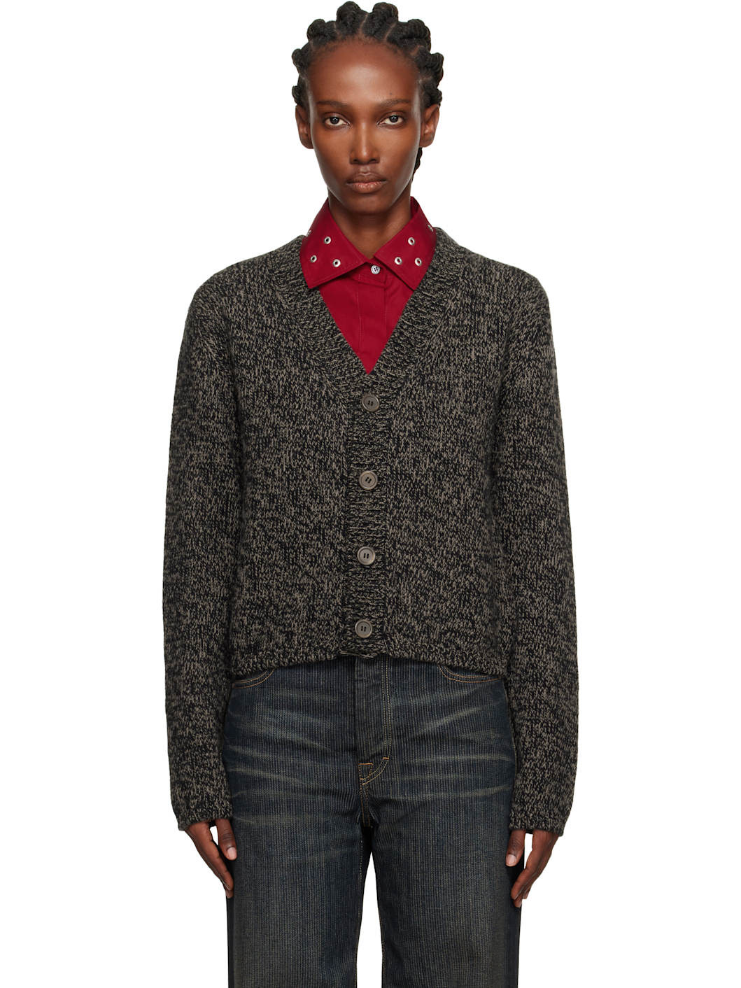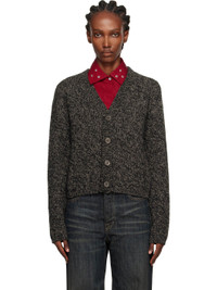 Knit wool cardigan. · Rib-knit Y-neck, hem, and cuffs · Button closure · Dropped shoulders · Mother-of-pearl hardware Supplier color: Bear Twist Mouline Wool Body: 100% wool. Trim: 100% mother of pearl. Made in Portugal 252803F095004