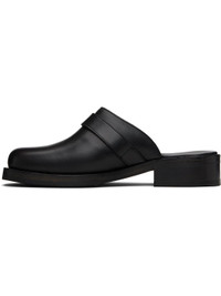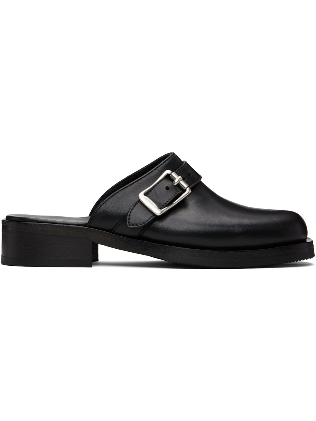 Buffed leather slip-on loafers. · Square toe · Pin-buckle strap at vamp · Logo embossed at footbed · Buffed leather lining · Stacked Kilger leather block heel and midsole · Treaded Vibram® rubber sole · Heel: H1.5" Supplier color: Black leather Upper: leather. Sole: rubber. Made in Portugal 252803F121001