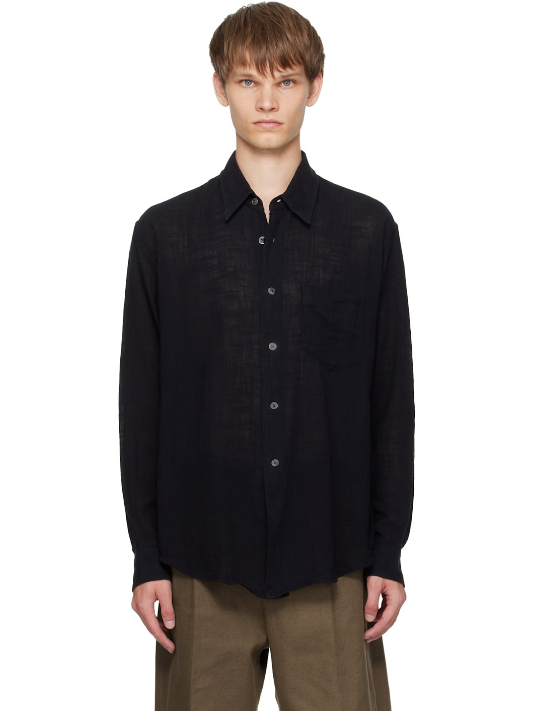 Semi-sheer cotton gauze shirt. · Spread collar · Button closure · Patch pocket at chest · Shirttail hem · Dropped shoulders · Buttoned barrel cuffs · Box pleat at back yoke · Mother-of-pearl hardware Supplier color: Washed black air cotton Body: 100% cotton. Trim: 100% mother of pearl. Made in Portugal 252803M192020