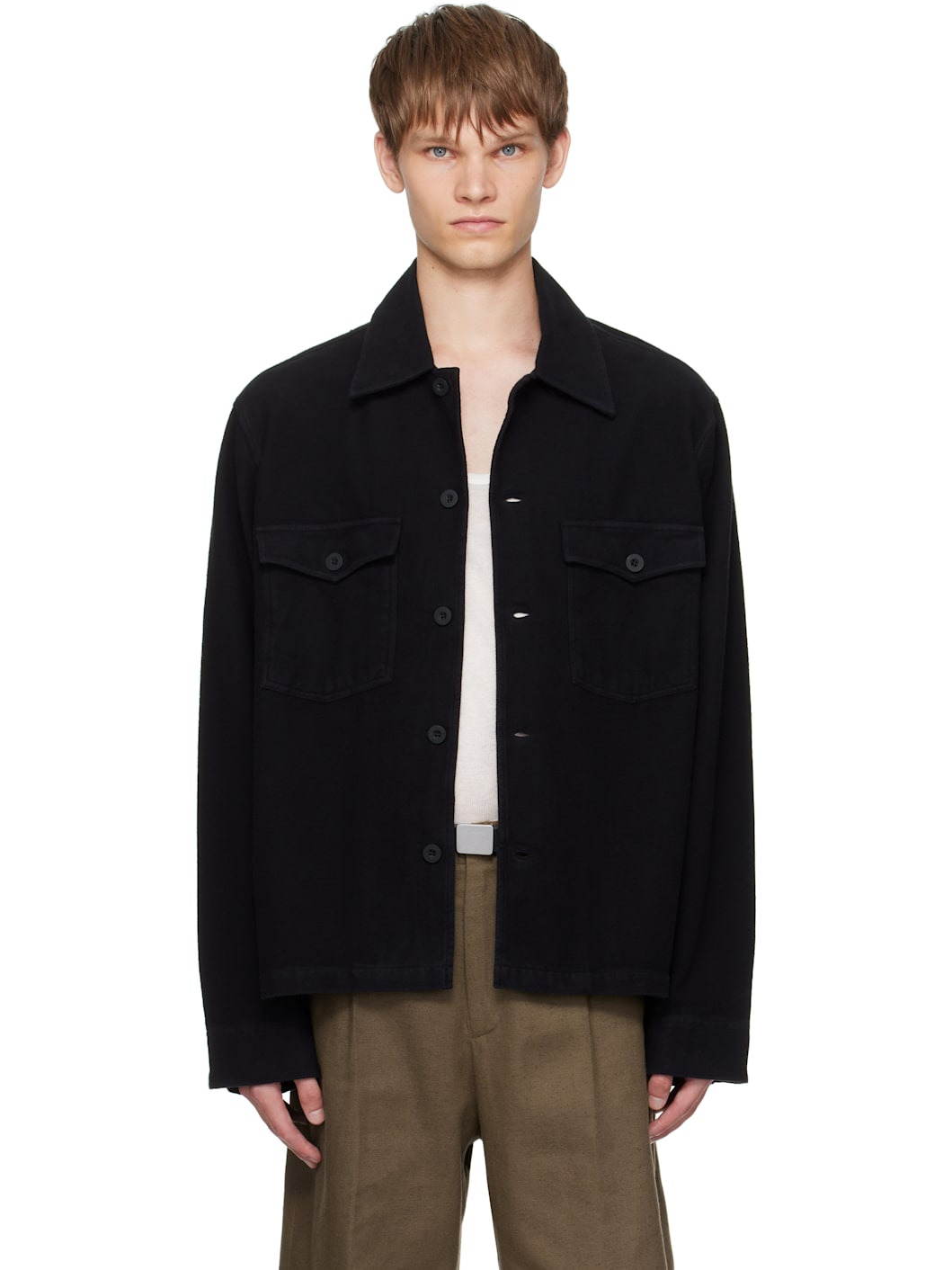 Piece-dyed cotton fleece jacket. · Spread collar · Button closure · Flap pockets at chest · Galalith hardware Supplier color: Black brushed cotton 100% cotton. Made in Portugal 252803M180010