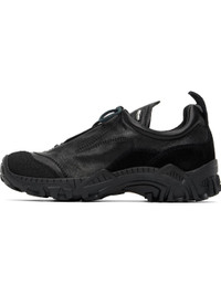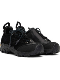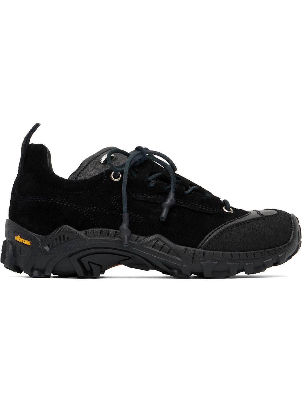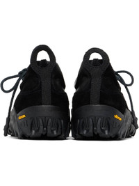Low-top goatskin suede and grained leather sneakers in black. · Textured rubber cap toe · Offset lace-up closure · Logo hardware at tongue · Padded collar · Pull-loop at heel collar · Buffed leather lining · Treaded Vibram® rubber sole · Logo-engraved silver-tone hardware Supplier color: Stealth black Upper: goatskin, leather, rubber. Sole: rubber. Made in Portugal 251803F128003
