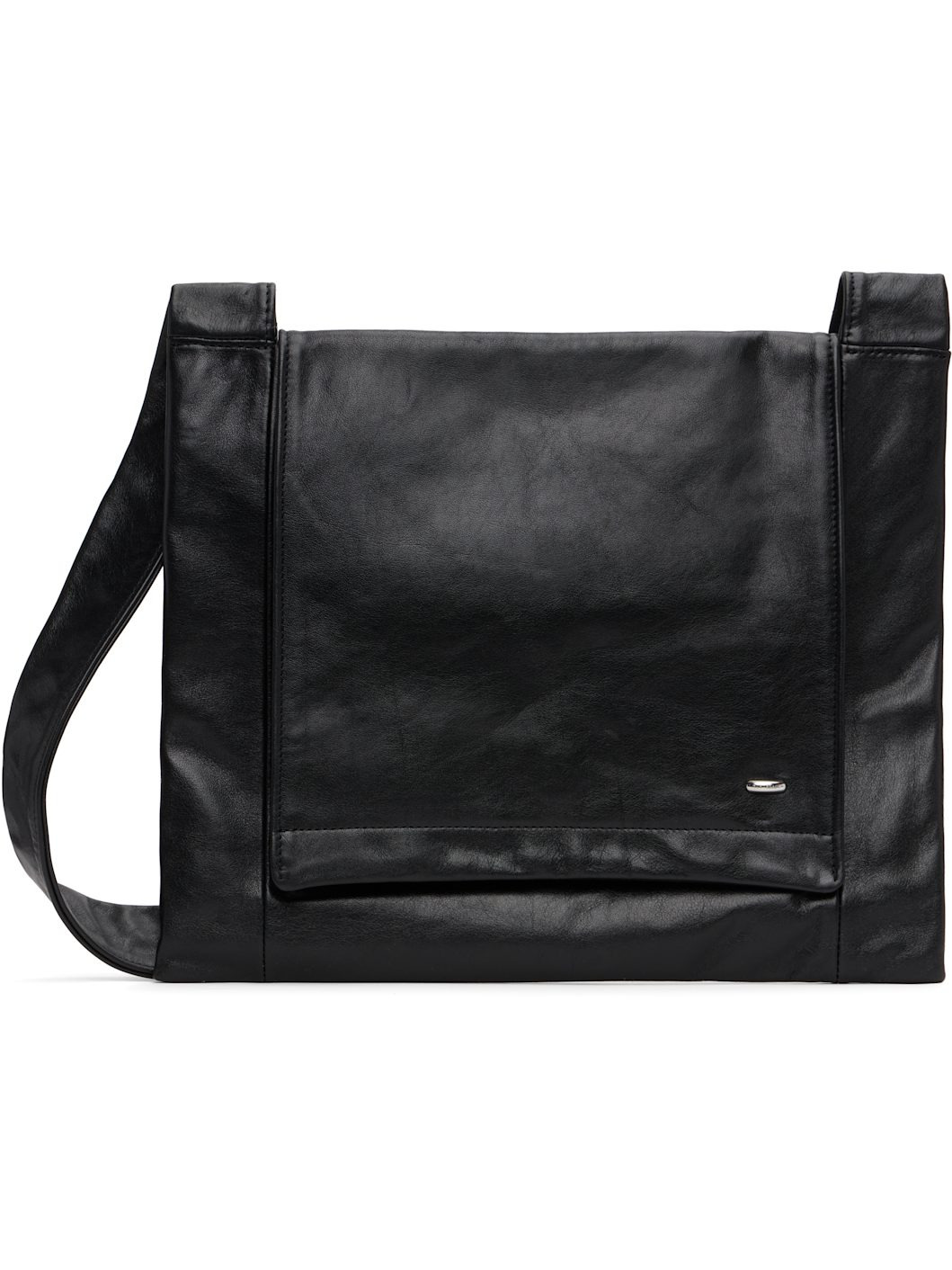 Grained bullskin messenger bag. · Fixed crossbody strap · Magnetic flap with logo rivet · Patch pocket at interior · Satin lining · H12" x W10.5" Supplier color: Malleable Black Bull Hide Bullskin. Made in Portugal 252803M170003