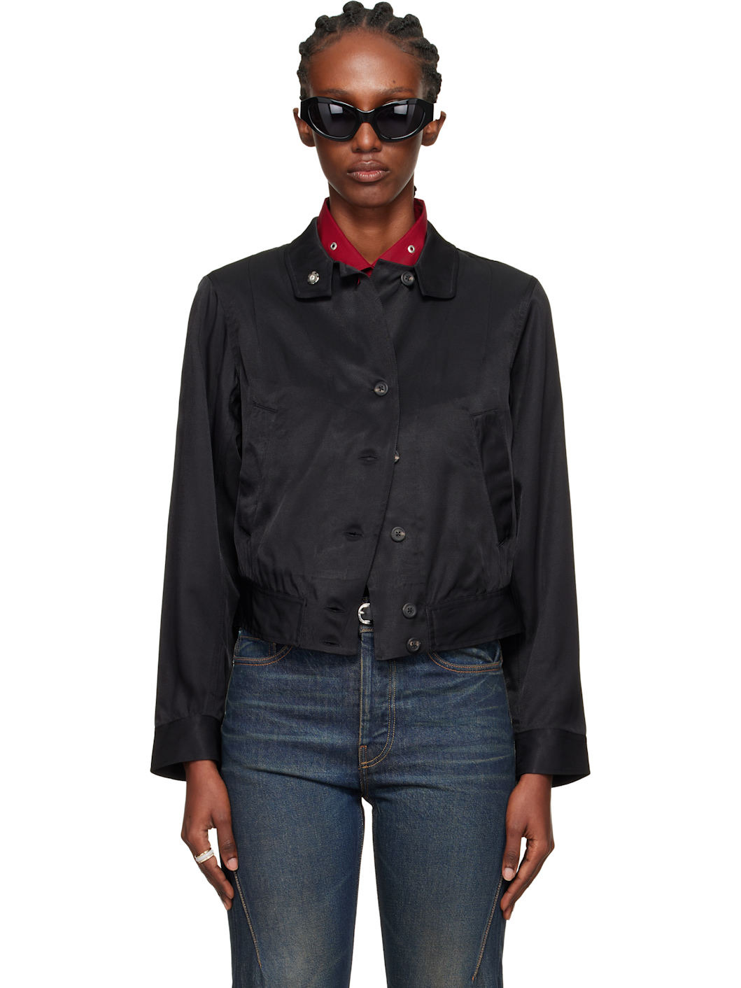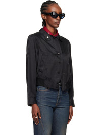 Viscose-blend twill bomber jacket. · Press-stud fastening at spread collar · Button closure · Welt pockets at front · Cropped hem · Buttoned barrel cuffs · Horn hardware Supplier color: Fresh black tarmac twill Body: 77% viscose, 23% rayon. Trim: 100% cotton. Made in Portugal 252803F058000