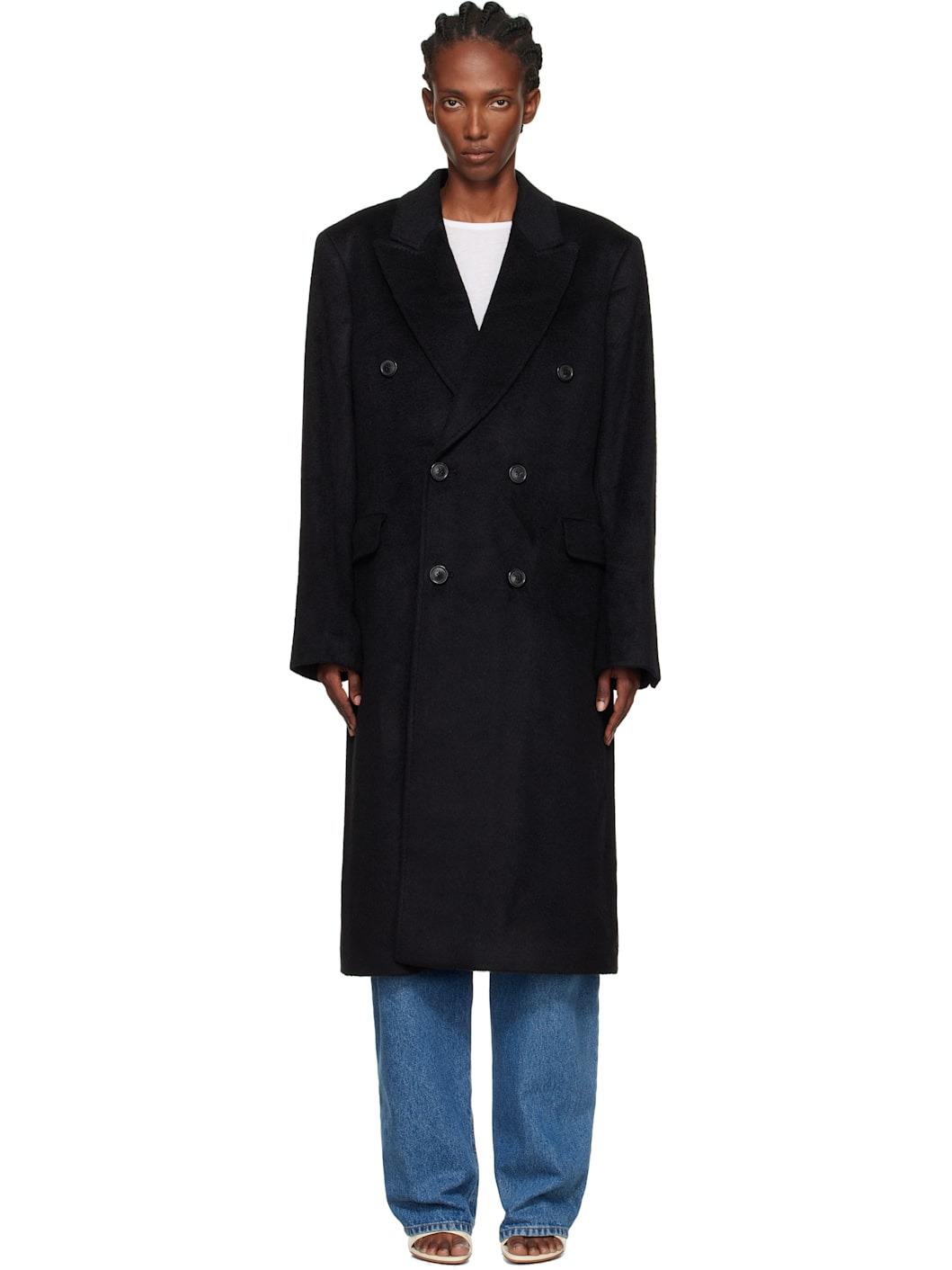 Wool- and mohair-blend melton coat. · Peaked lapel · Double-breasted button closure · Flap pockets at front · Padded shoulders · Surgeon's cuffs · Central vent at back hem · Welt pockets at interior · Full satin lining · Horn hardware Supplier color: Black hair wool Body: 50% wool, 30% mohair, 20% polyamide. Trim: 100% cotton. Lining: 100% viscose. Made in Portugal 252803F059005