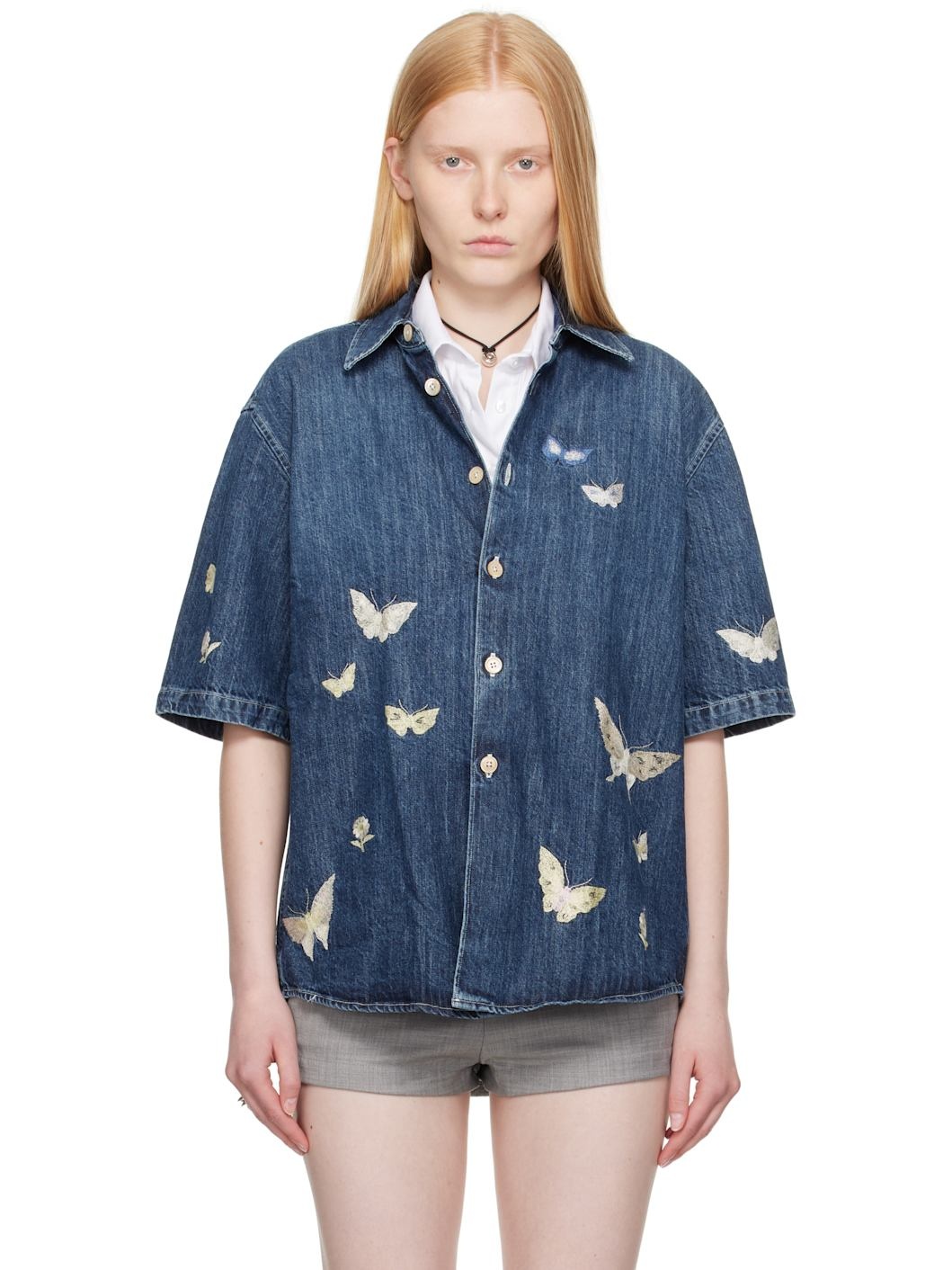 Non-stretch denim shirt. Embroidered graphics and fading throughout. · Spread collar · Button closure · Shirttail hem · Box pleat at back yoke · Mother-of-pearl hardware · Contrast stitching in white Supplier color: Western blue butterfly 100% cotton. Made in Portugal 251803F109003