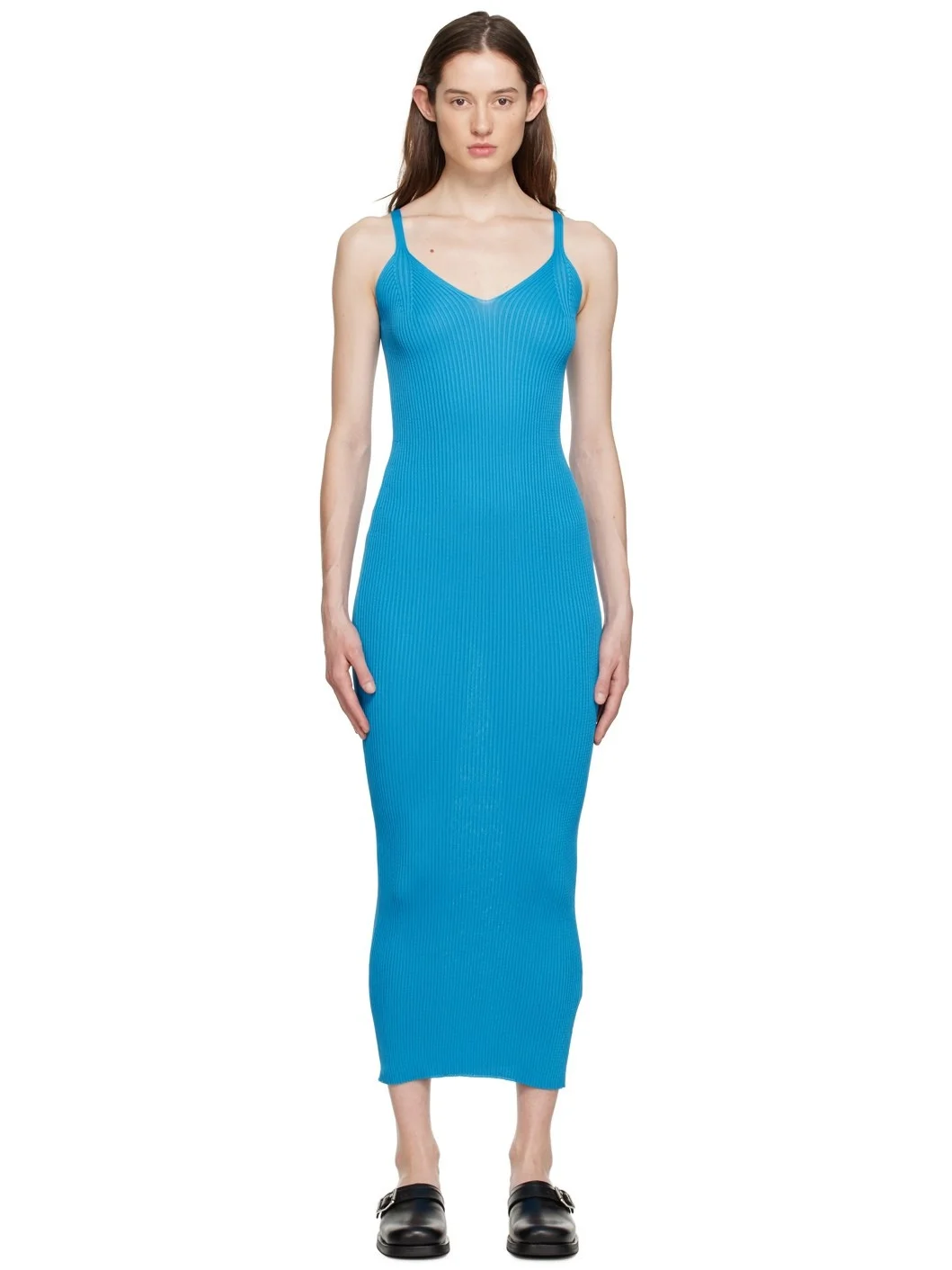 Rib knit polyester dress. · V-neck · Fixed shoulder straps · Unlined Supplier color: Circuit blue perform 100% polyester. Made in Italy 231803F054001
