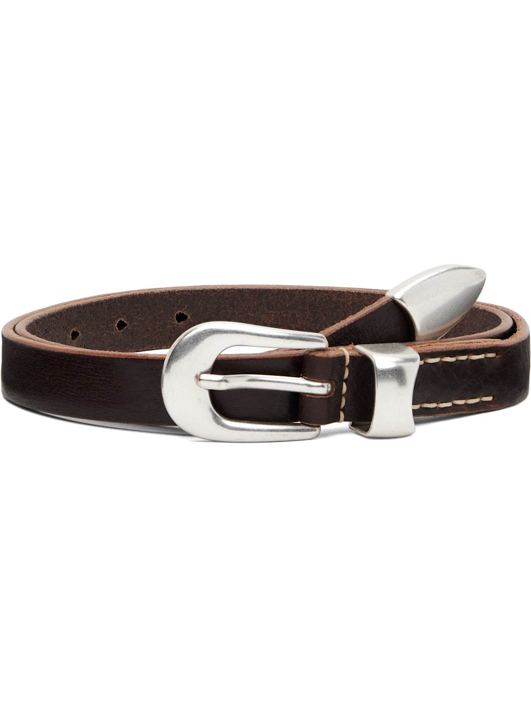 Grained calfskin belt. · Silver-tone keeper loop at length · Hardware at end · Pin-buckle fastening · W0.75" Supplier color: Brown leather Calfskin. Made in Portugal 252803F001007