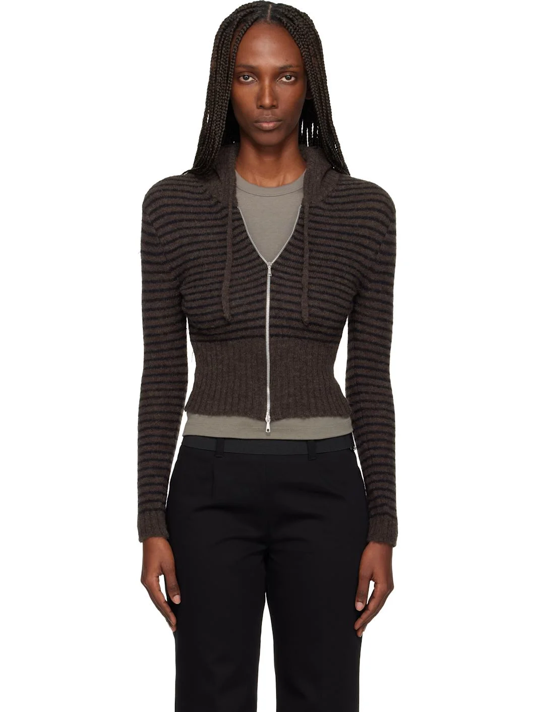 Knit alpaca- and wool-blend hoodie. · Stripes throughout · Drawstring at hood · Two-way zip closure · Rib-knit hem and cuffs Supplier color: Dirt stripe fuzzy alpaca 55% alpaca, 30% polyamide, 15% wool. Made in Portugal 252803F097007