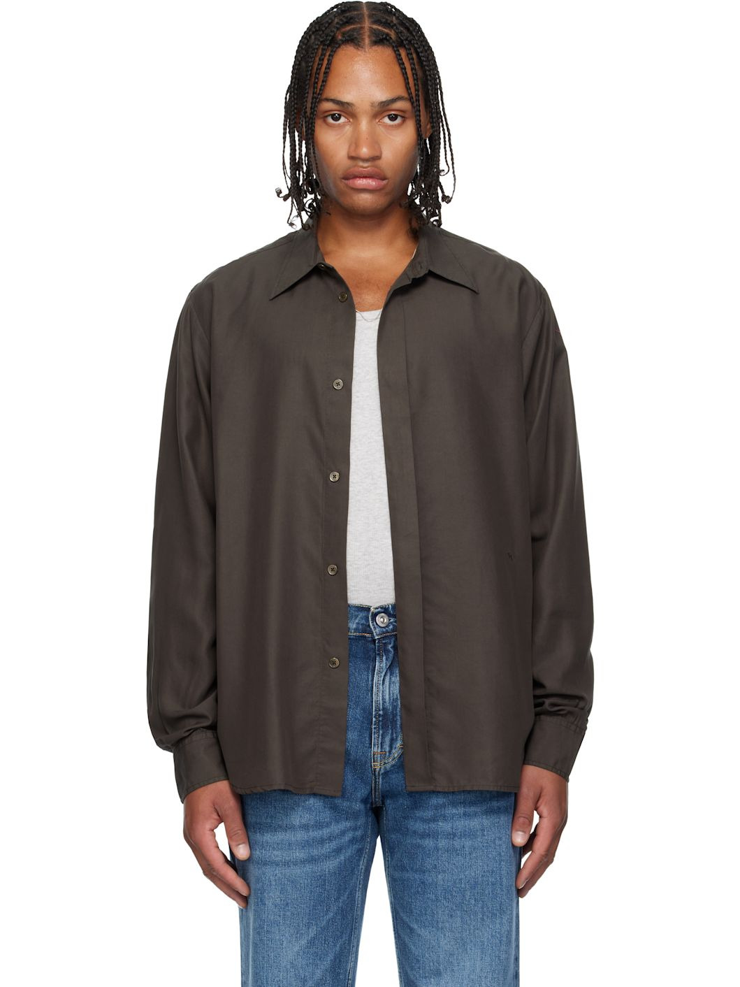 Plain-woven TENCEL™ lyocell shirt. · Pointed collar · Concealed button closure · Shirttail hem · Pleats at buttoned barrel cuffs · Twin pleats at back yoke · Mother-of-pearl hardware Supplier color: Draping brown liquid 100% lyocell. Made in Portugal 252803M192006