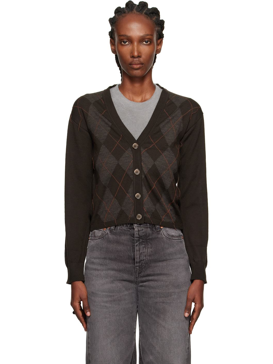 Knit wool cardigan. · Argyle pattern and loose threads throughout · Rib-knit Y-neck, hem, and cuffs · Button closure · Cropped hem · Dropped shoulders Supplier color: Pub Argyle Fine Wool Body: 100% wool. Trim: 100% merino wool. Made in Portugal 252803F095001