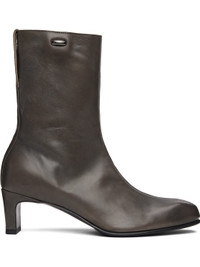 Ankle-high vegetable-tanned buffed leather boots. · Almond toe · Logo hardware at outer side · Zip closure at inner side · Pull-loop at heel collar · Covered block heel with rubber injection · Leather sole with rubber injection · Heel: H2.25" Supplier color: Phantom tensile cattle hide Upper: leather. Sole: rubber. Made in Italy 252803F113001