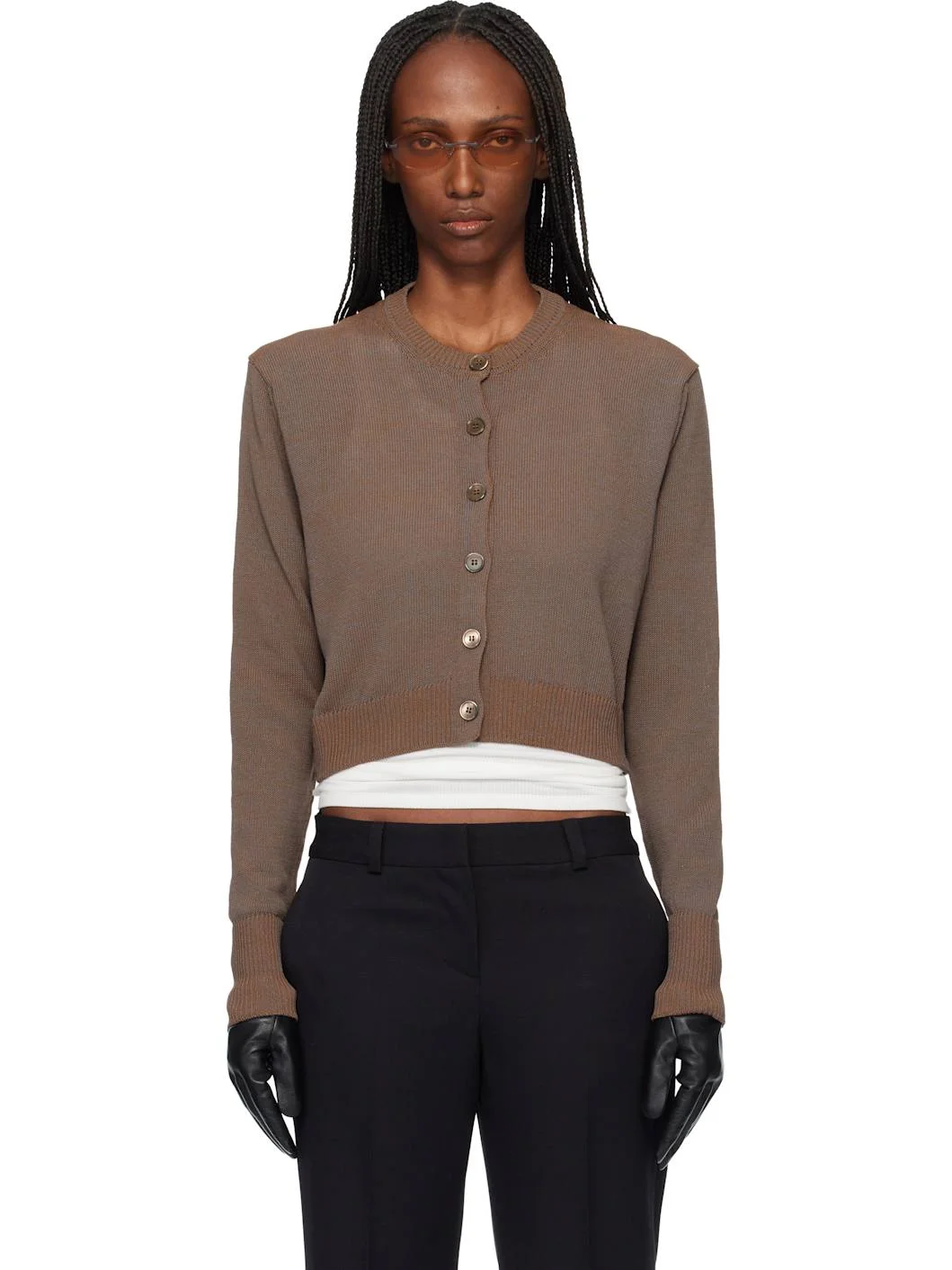 Knit cotton-blend cardigan. · Rib-knit crewneck, hem, and cuffs · Button closure · Mother-of-pearl hardware Supplier color: Cangiante Copper Tech Cotton 75% cotton, 25% nylon. Made in Portugal 261803F095005