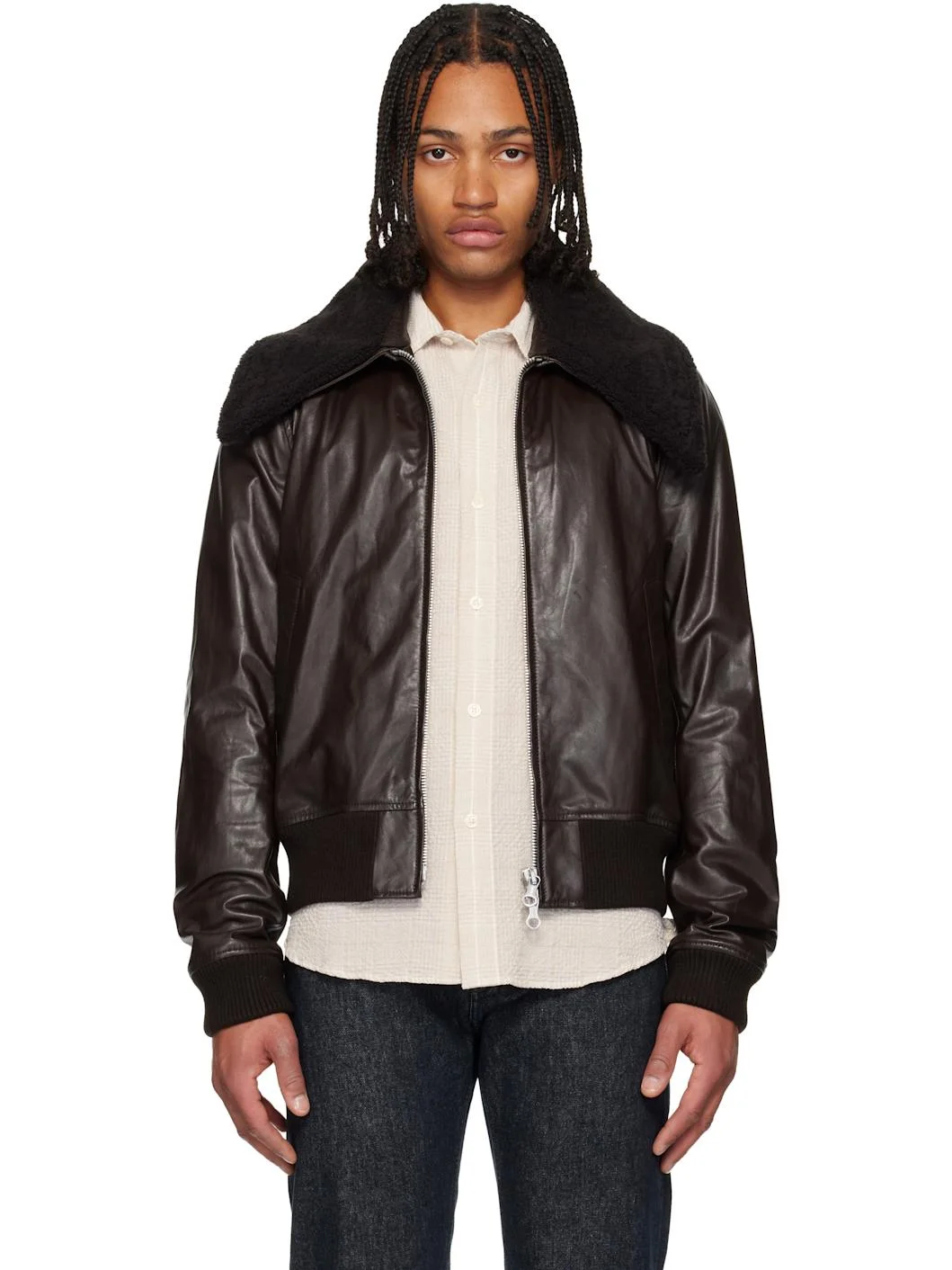 Buffed calfskin bomber jacket. · Detachable shearling trim at spread collar · Two-way zip closure · Welt pockets at front · Rib-knit hem and cuffs · Logo plaque at back collar · Welt pocket at interior · Full twill lining Supplier color: Umber brown fluid calfskin Body: 100% calfskin. Trim: 100% lambskin. Lining: 52% viscose, 48% cotton. Made in Turkey 252803M181001