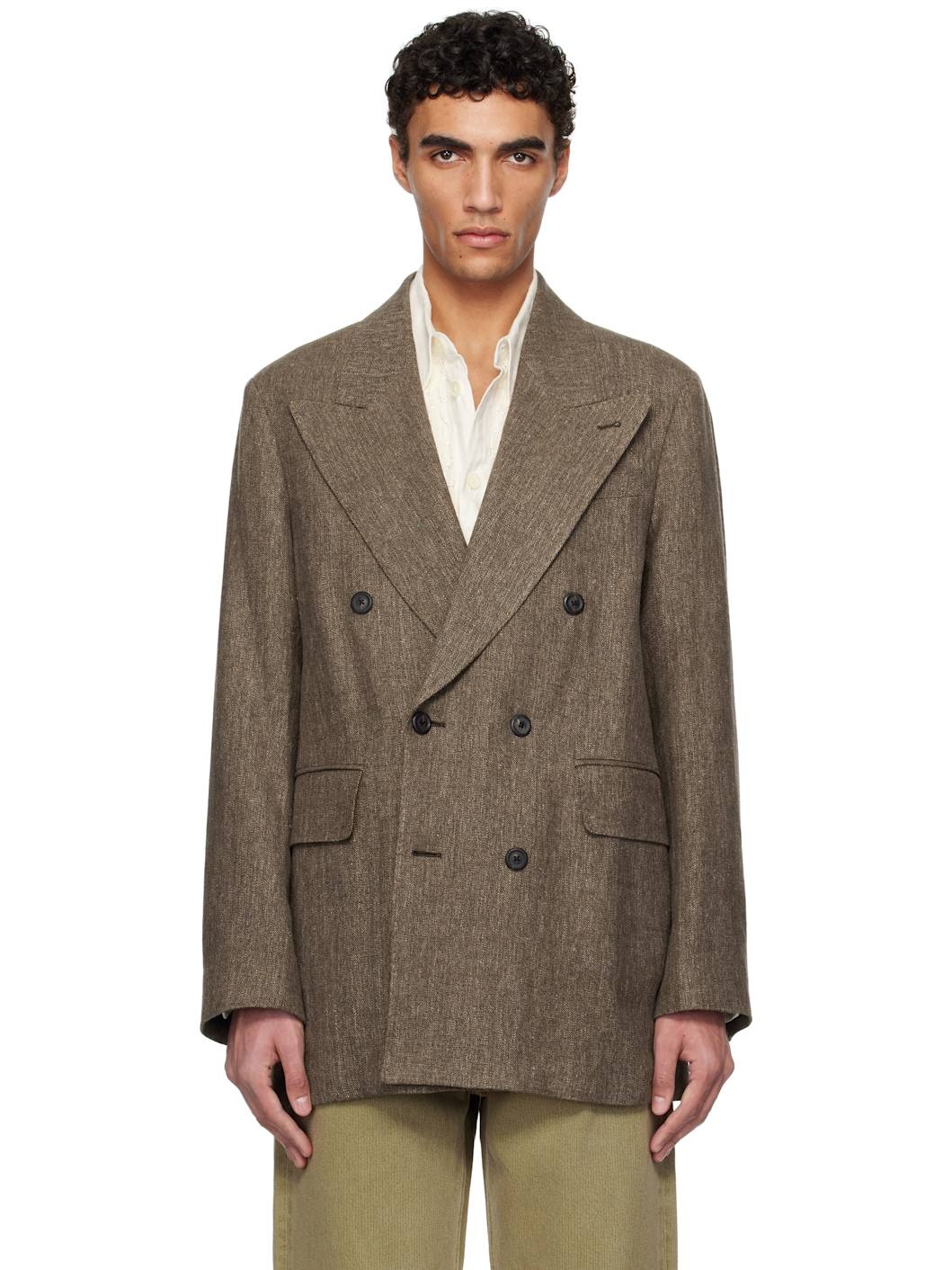 Linen- and cotton-blend hopsack blazer · Peaked lapel · Double-breasted button closure · Welt pocket and flap pockets · Central vent at back hem · Locker loop at inner collar · Partial viscose satin lining · Horn hardware Supplier color: Tobacco delave linen Body: 77% linen, 23% cotton. Lining: 55% viscose, 45% acetate. Made in Portugal 251803M195003