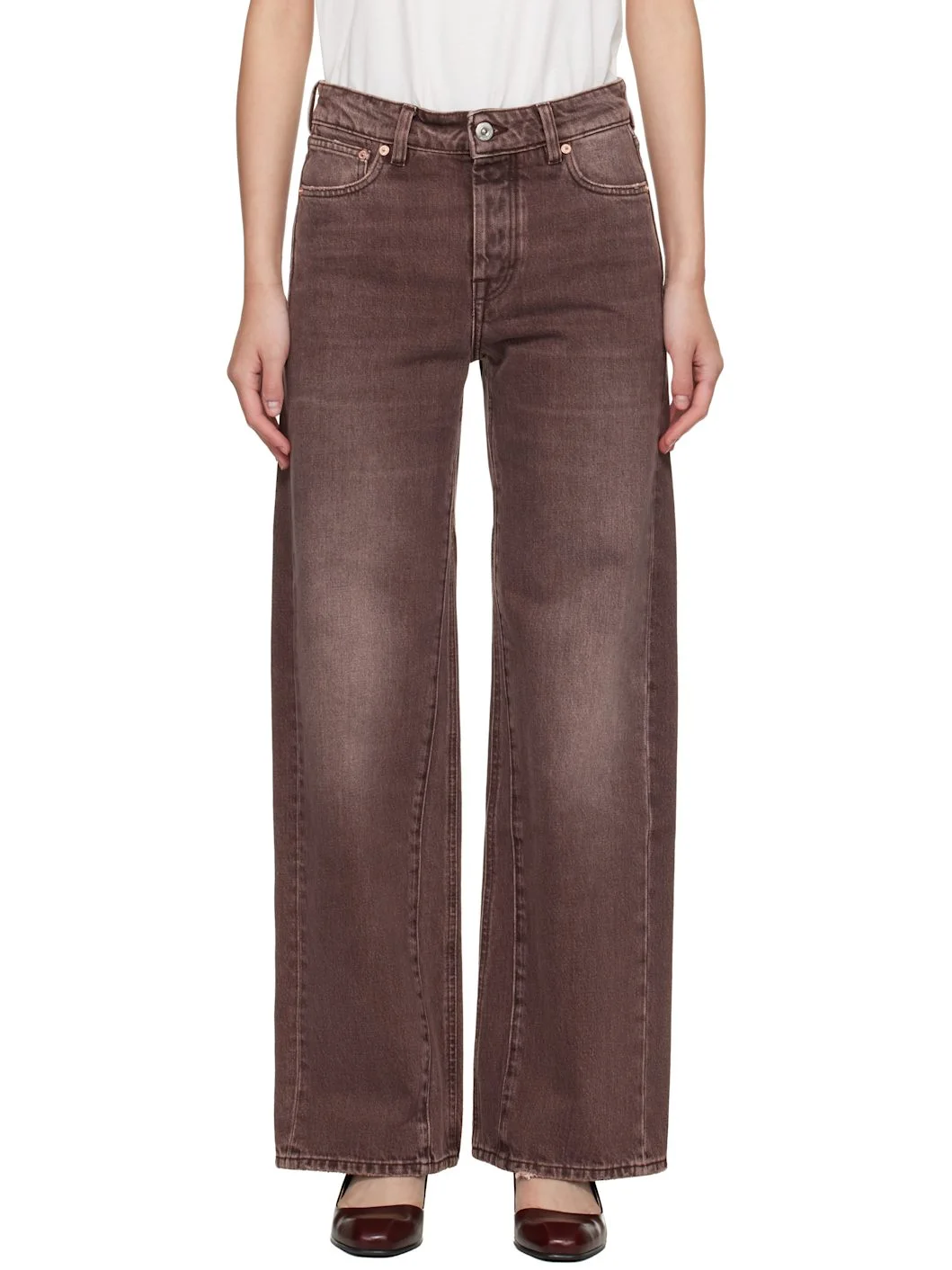 Pigment-dyed non-stretch denim jeans. · Fading, whiskering, and subtle distressing throughout · Loose-fit · Belt loops · Five-pocket styling · Button fly · Paneled inseam · Rubberized logo patch at back waistband Supplier color: Overdyed choco melon 100% cotton. Made in Portugal 261803F069013