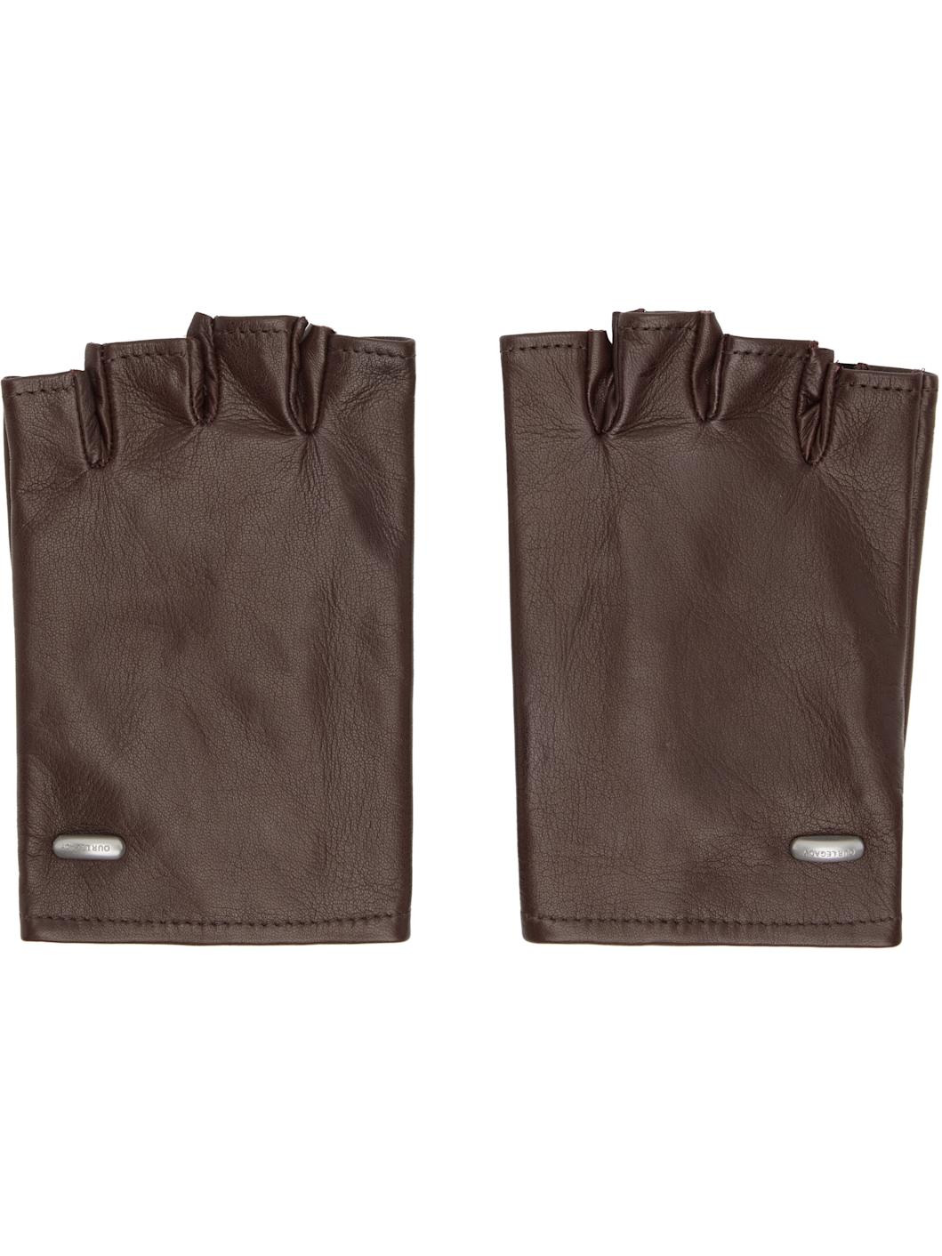 Grained lambskin fingerless gloves. · Logo stud at elasticized cuffs · Knit silk lining Supplier color: Currant red nappa Body: 100% lambskin. Lining: 100% silk. Made in Italy 252803M135004