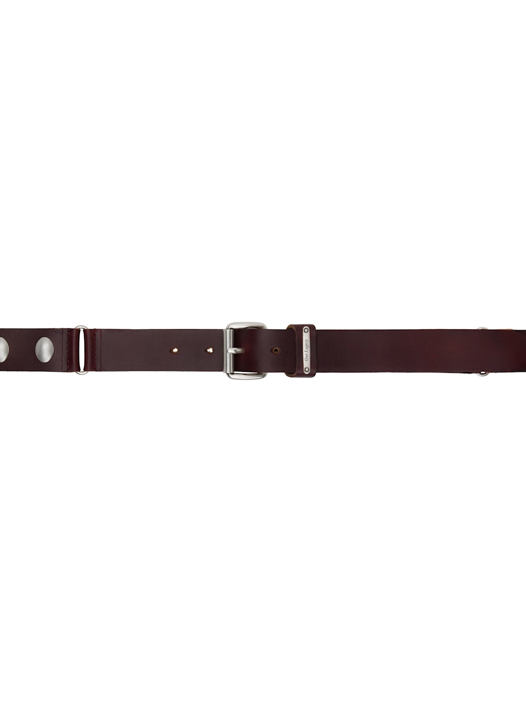 Buffed Chromexcel® leather belt in burgundy. · Studs throughout · Logo plaque at keeper loop · Pin-buckle fastening · Silver-tone hardware · W1.25" Supplier color: Burgundy chromexcel leather Leather. Made in Portugal 251803M131010
