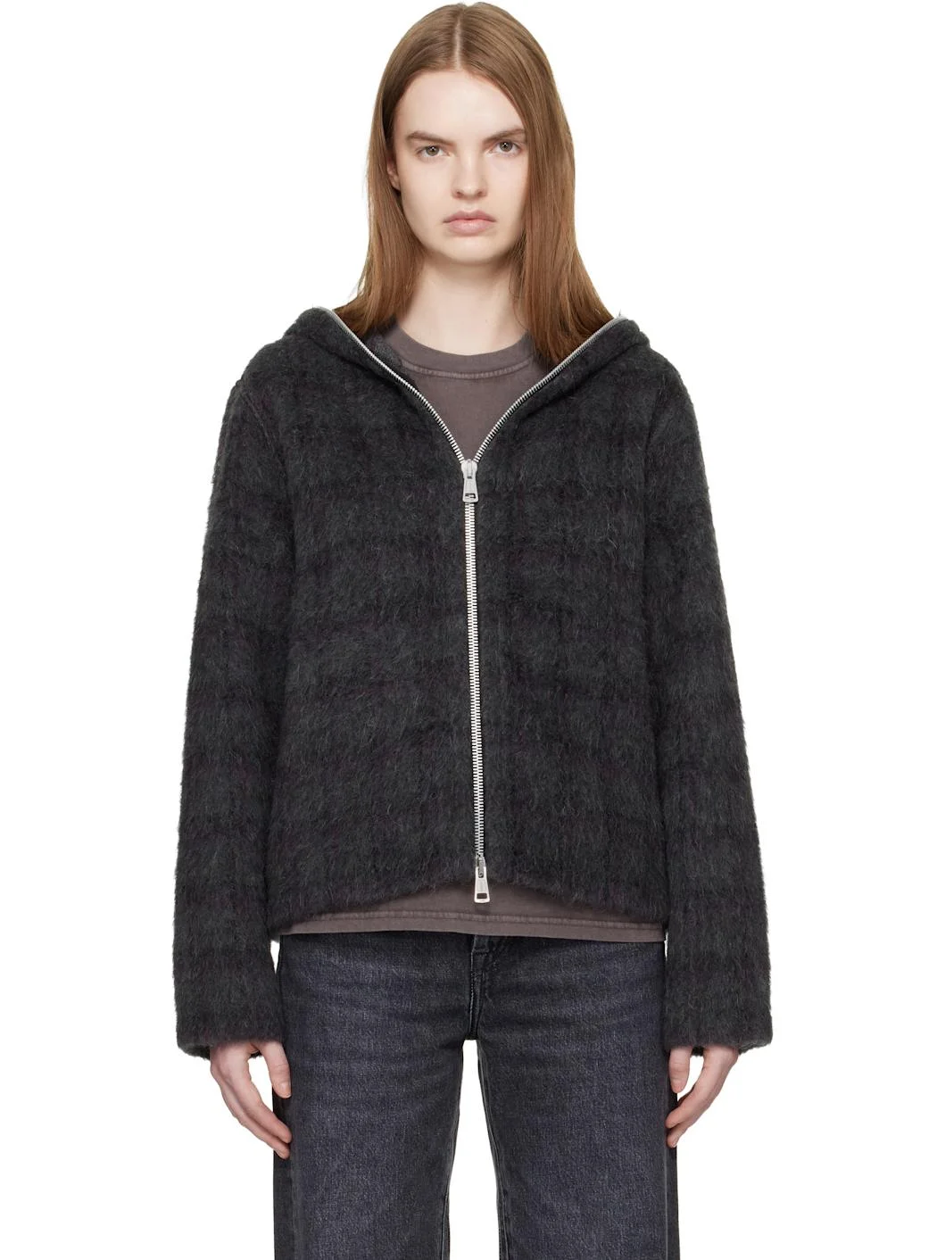 Brushed wool- and alpaca-blend jacket. · Check pattern throughout · Two-way zip closure extends to hood · Unlined Supplier color: Fuzzed Plum Check Hairy Wool 36% wool, 26% polyester, 22% acrylic, 11% alpaca, 3% polyamide, 2% other. Made in Portugal 261803F097006