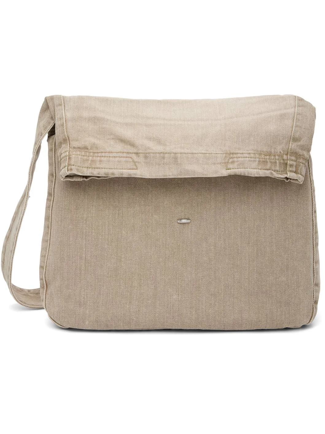Organic cotton denim messenger bag. · Pigment-dyed · Fading throughout · Adjustable crossbody strap · Logo hardware at face · Foldover flap · Patch pocket at interior · Twill lining · H19" x W14.5" x D4.5" Supplier color: Olive breeze wash Textile. Made in Portugal 261803F048001