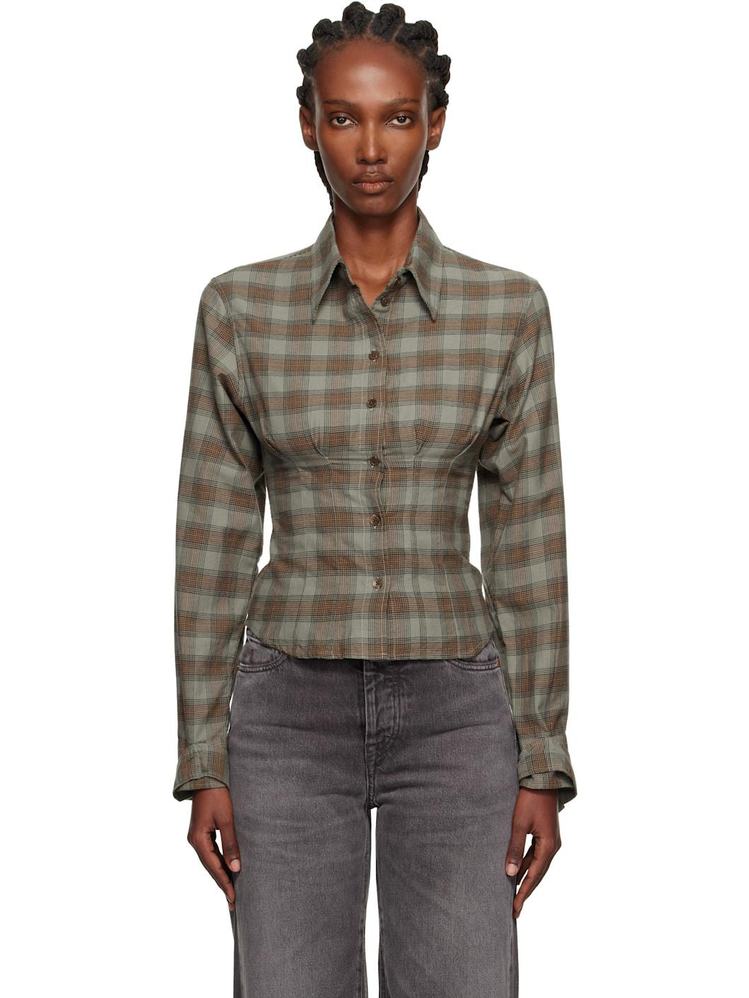 Cotton broken twill shirt. · Check pattern throughout · Spread collar · Button closure · Pleats and darts at front · Cropped shirttail hem · Press-stud strap at buttoned barrel cuffs · Box pleat at back yoke · Mother-of-pearl hardware Supplier color: Iowa Flannel Check Body: 100% cotton. Trim: 100% mother of pearl. Made in Portugal 252803F109008