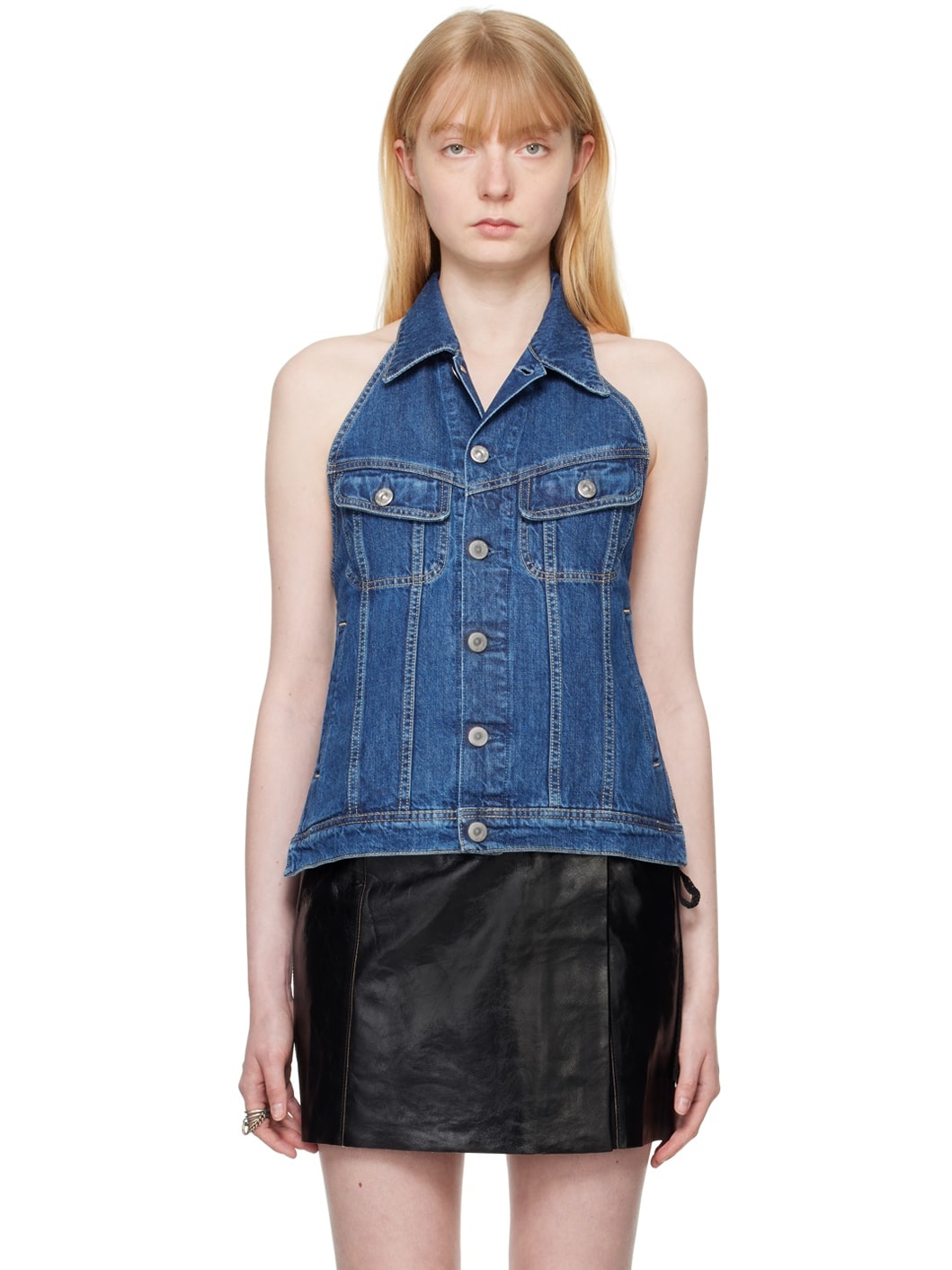 Indigo-dyed non-stretch denim vest. · Spread collar at halter neck · Button closure · Flap pockets and welt pockets · Cinch strap at open back Supplier color: Western blue denim 100% cotton. Made in Portugal 241803F057004