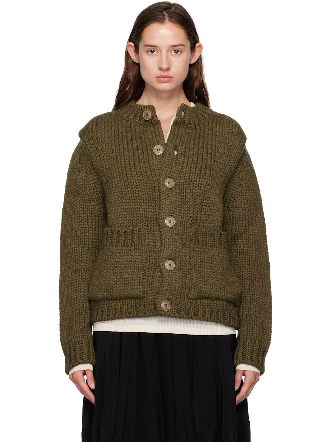 Heavyweight knit wool- and alpaca-blend cardigan. · Rib-knit crewneck, hem, and cuffs · Button closure · Patch pockets at front · Corozo hardware Supplier color: Olive mega alpaca 70% wool, 30% alpaca. Made in Portugal 252803F095000