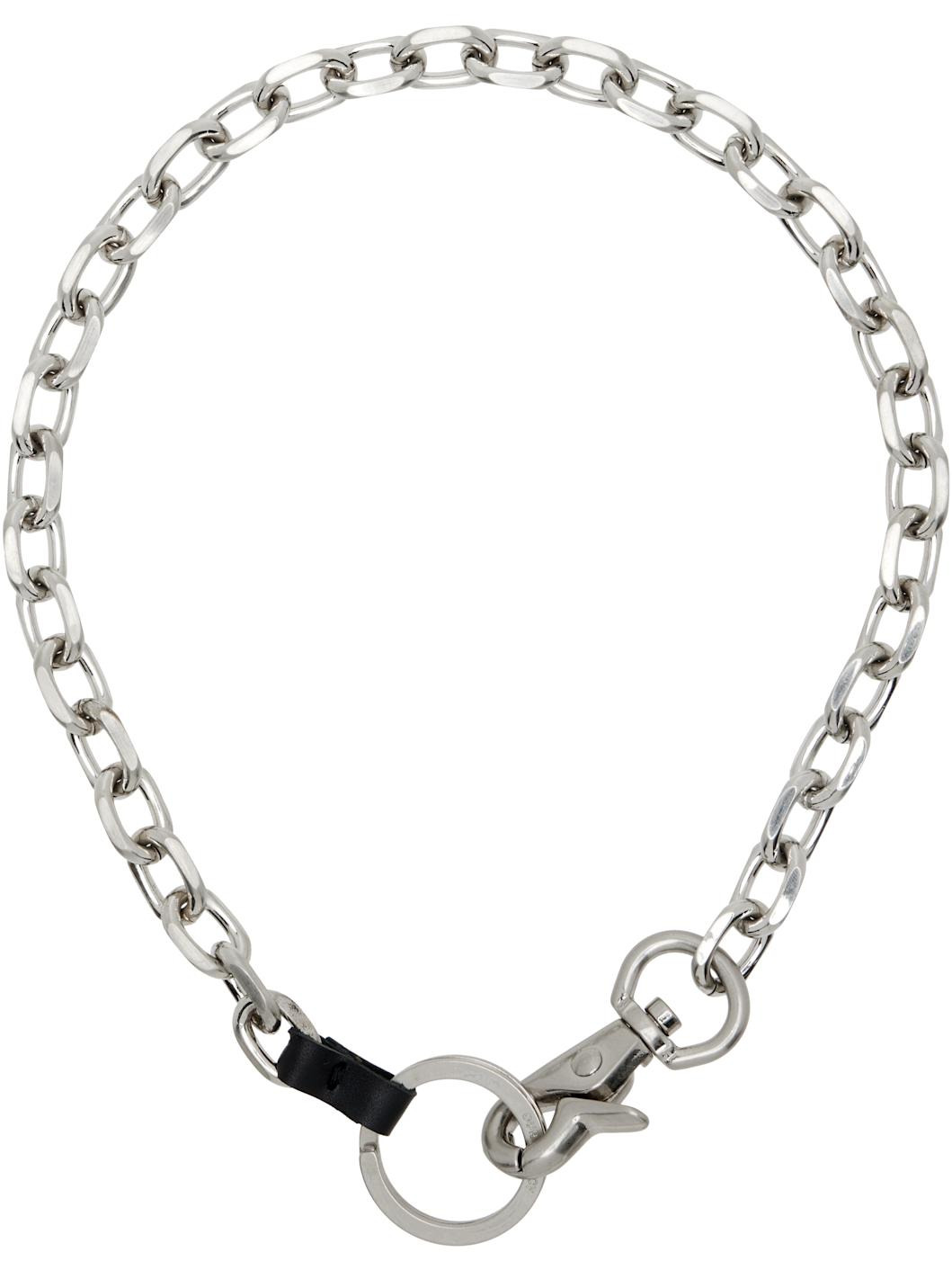 Cable chain necklace in silver-tone brass. · Logo-engraved key ring at length · Hand-stitched leather tab · Lobster-clasp fastening · L19" Supplier color: Matte Brass, leather. Made in Portugal 252803M145010