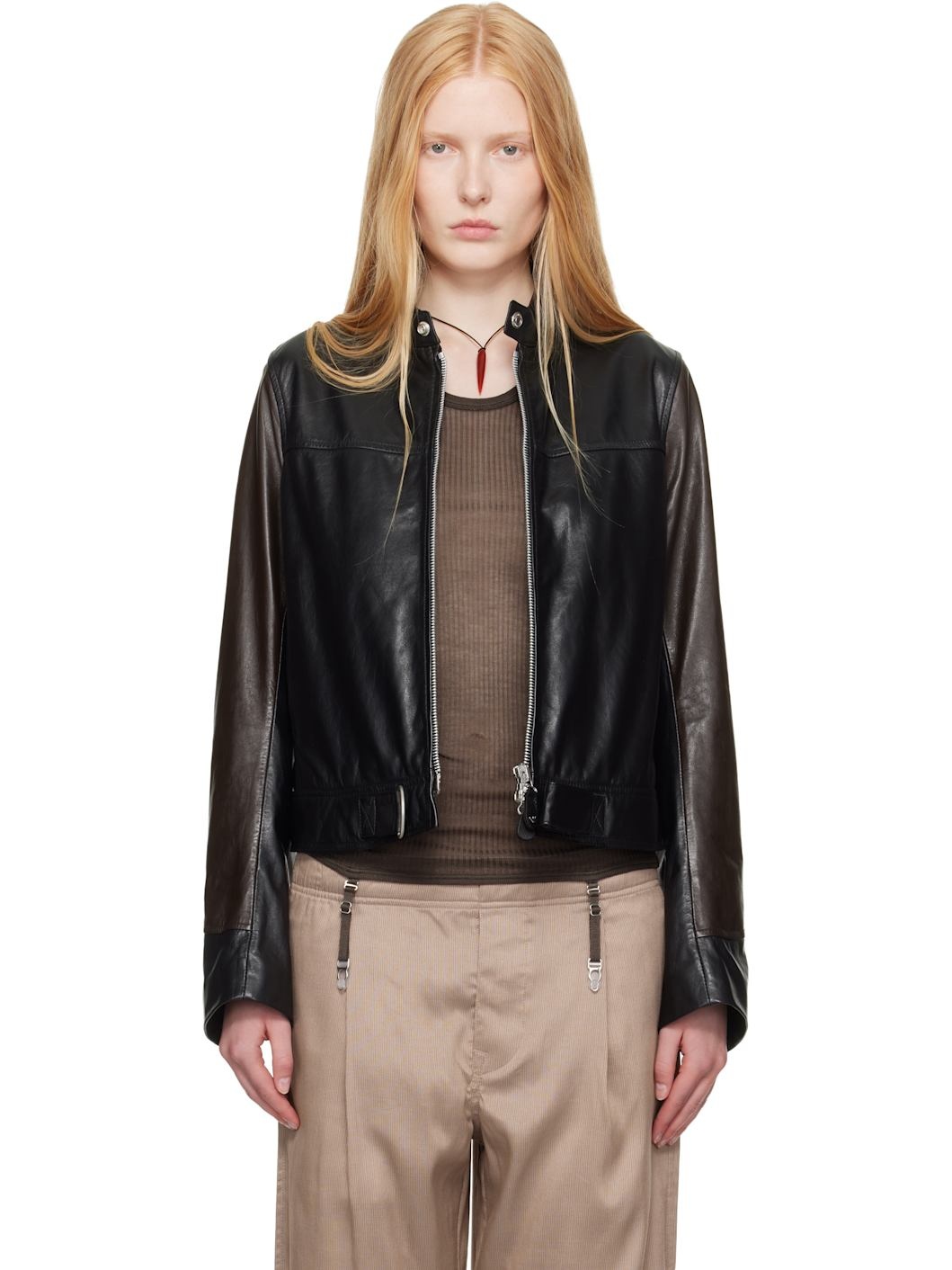 Grained calfskin jacket. · Press-stud fastening at band collar · Two-way zip closure · Seam pockets · Velcro tab at front hem · Zip vent at cuffs · Welt pockets at interior · Full plain-woven lining · Logo-engraved silver-tone hardware Part of the OUR LEGACY WORK SHOP, in collaboration with Emporio Armani. Supplier color: Liquirzia leather Body: 100% calfskin. Lining: 70% cotton, 30% viscose. Made in Turkey 252803F063006