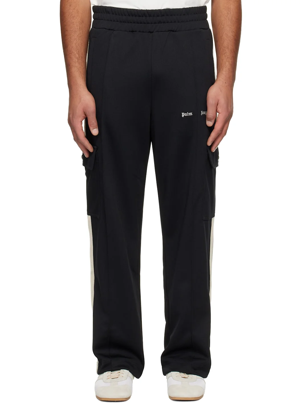 Loose-fit and straight-leg interlock jersey track pants. · Elasticized waistband · Two-pocket styling · Logo embroidered at front · Pinched seam at front legs · Striped knit trim and cargo pocket at outseams Supplier color: Black/Off-white 100% polyester. Made in Portugal 252695M188003