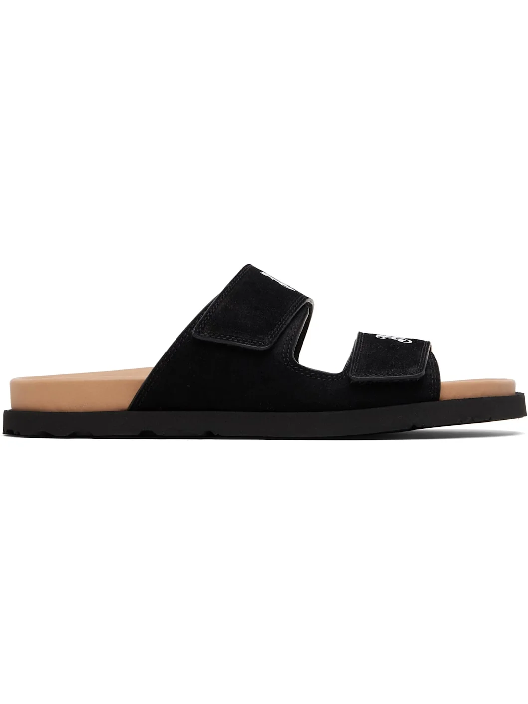 Calfskin suede sandals. · Open toe · Logo-printed velcro straps at vamp · Logo printed at molded footbed · Foam rubber midsole · Treaded rubber sole Supplier color: Black/Camel Upper: calfskin. Sole: rubber. Made in Spain 252695M234000