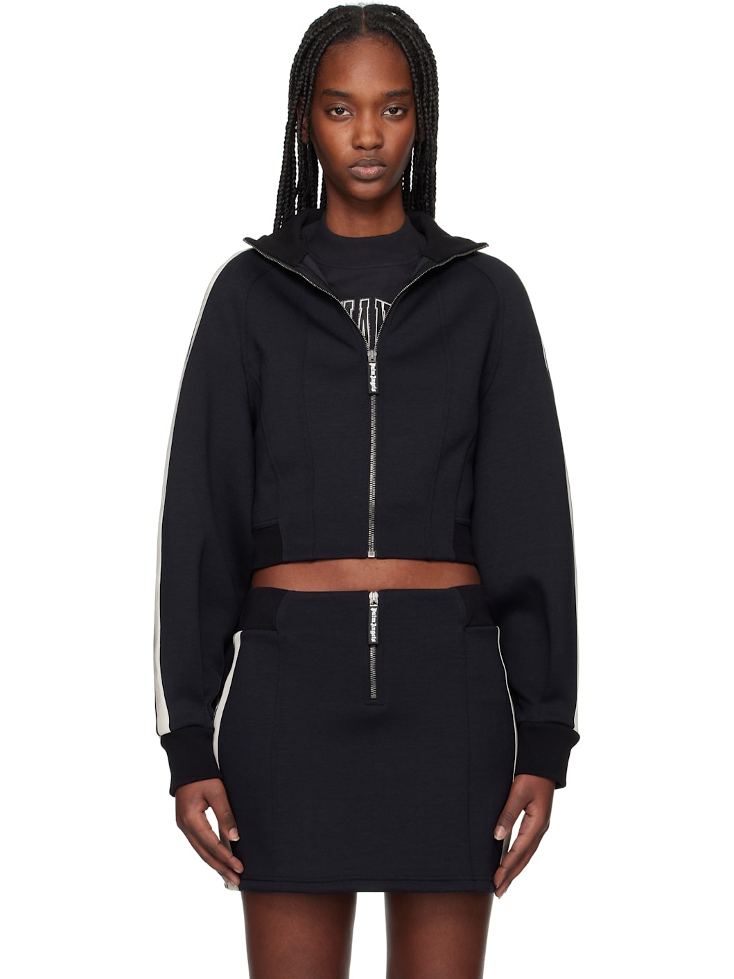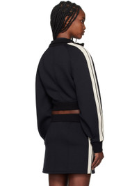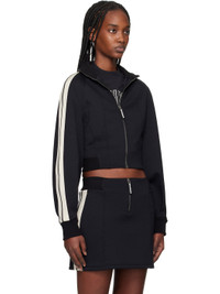 Stretch polyester- and rayon-blend neoprene track jacket. · Paneled construction · Rib-knit stand collar, hem, and cuffs · Zip closure · Cropped hem · Striped trim at raglan sleeves · Full interlock jersey lining Supplier color: Black/Off white Body: 80% polyester, 15% rayon, 5% polyurethane. Trim 1: 95% cotton, 3% polyamide, 2% elastane. Trim 2: 100% polyester. Lining: 100% cotton. Made in Italy 251695F063000