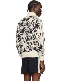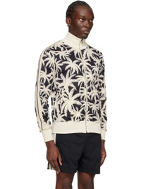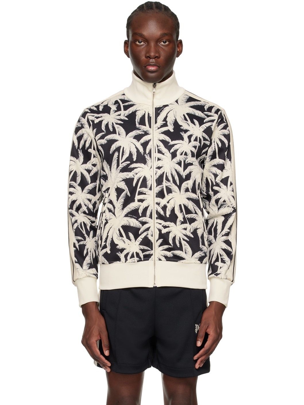Polyester jersey track jacket. Logo graphic printed throughout. · Rib knit stand collar, hem, and cuffs · Zip closure · Zip pockets · Striped trim at sleeves Supplier color: Black/Off white Body: 100% polyester. Trim: 96% polyester, 4% elastane. Lining: 100% polyester. Made in Italy 241695M202011