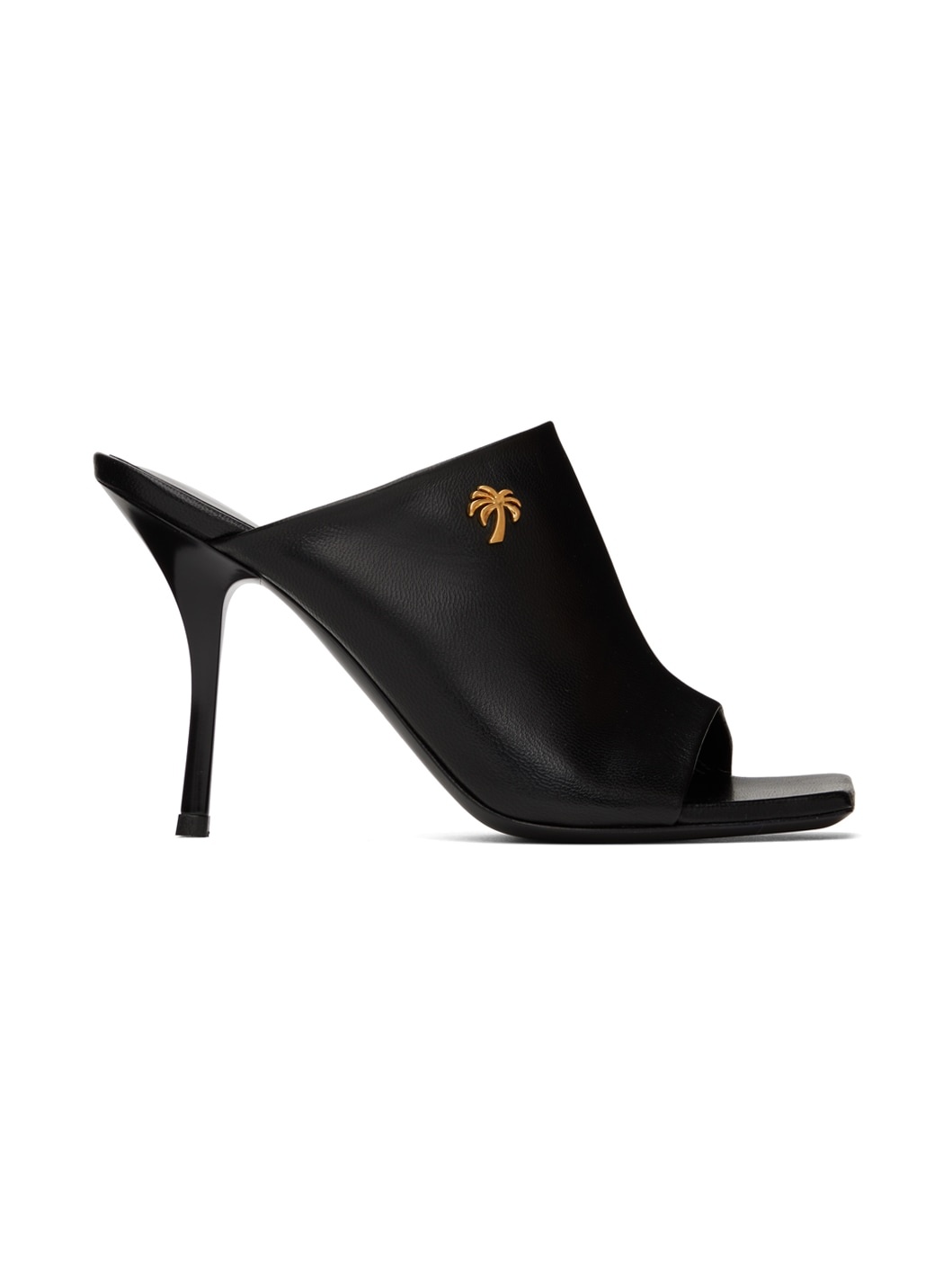 Grained leather heels in black. · Open square toe · Logo hardware at vamp · Logo embossed at padded leather footbed · Rubber stiletto heel · Leather sole · Heel: H3.5 in Supplier color: Black Leather. Made in Italy 232695F122001