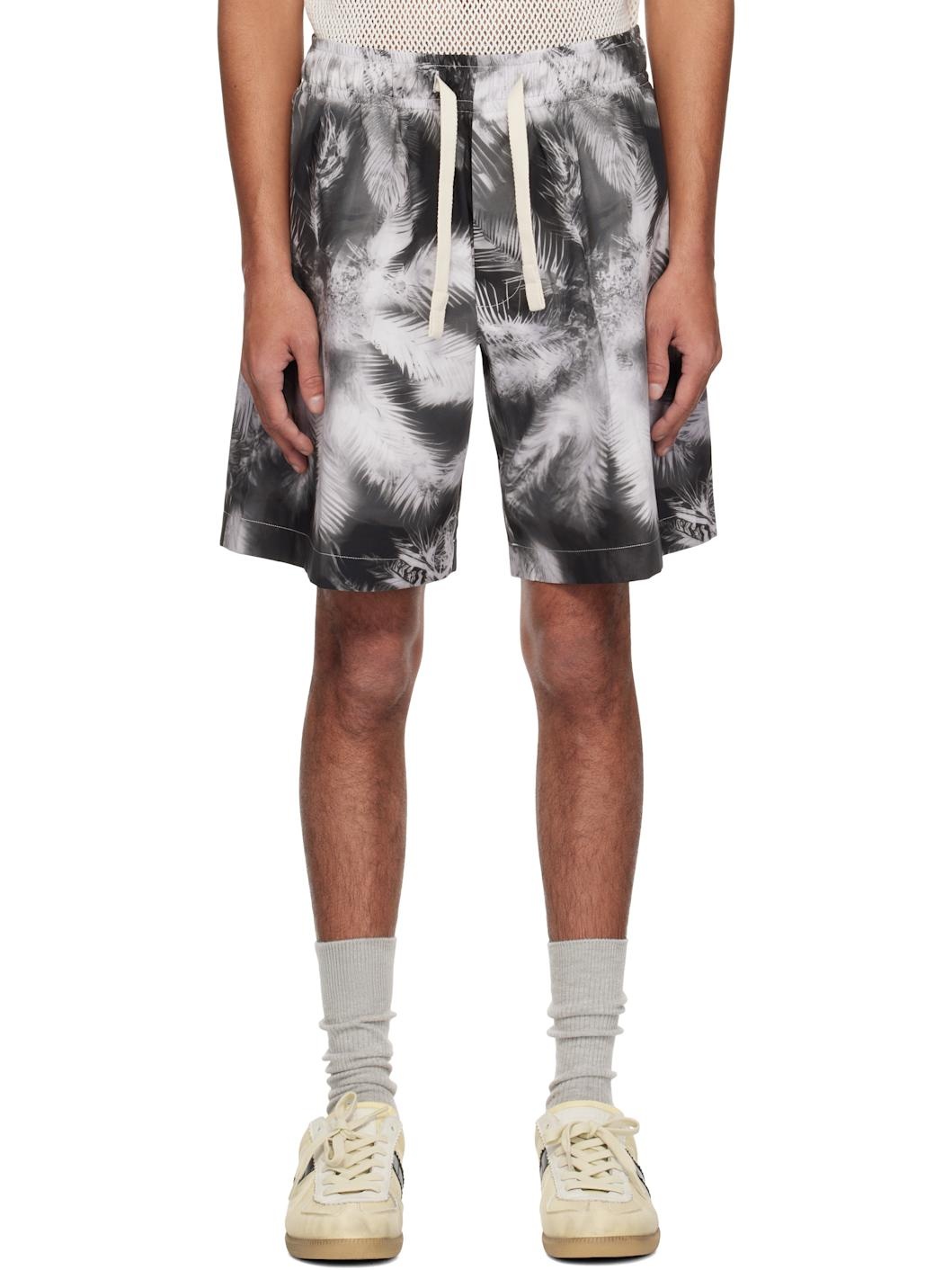 Cotton taffeta shorts. Graphic pattern printed throughout. · Drawstring at elasticized waistband · Three-pocket styling · Mock fly · Logo flag at back patch pocket · Contrast stitching in white Supplier color: Black/Off white Body: 100% cotton. Trim: 100% cotton. Made in Bulgaria 251695M193022
