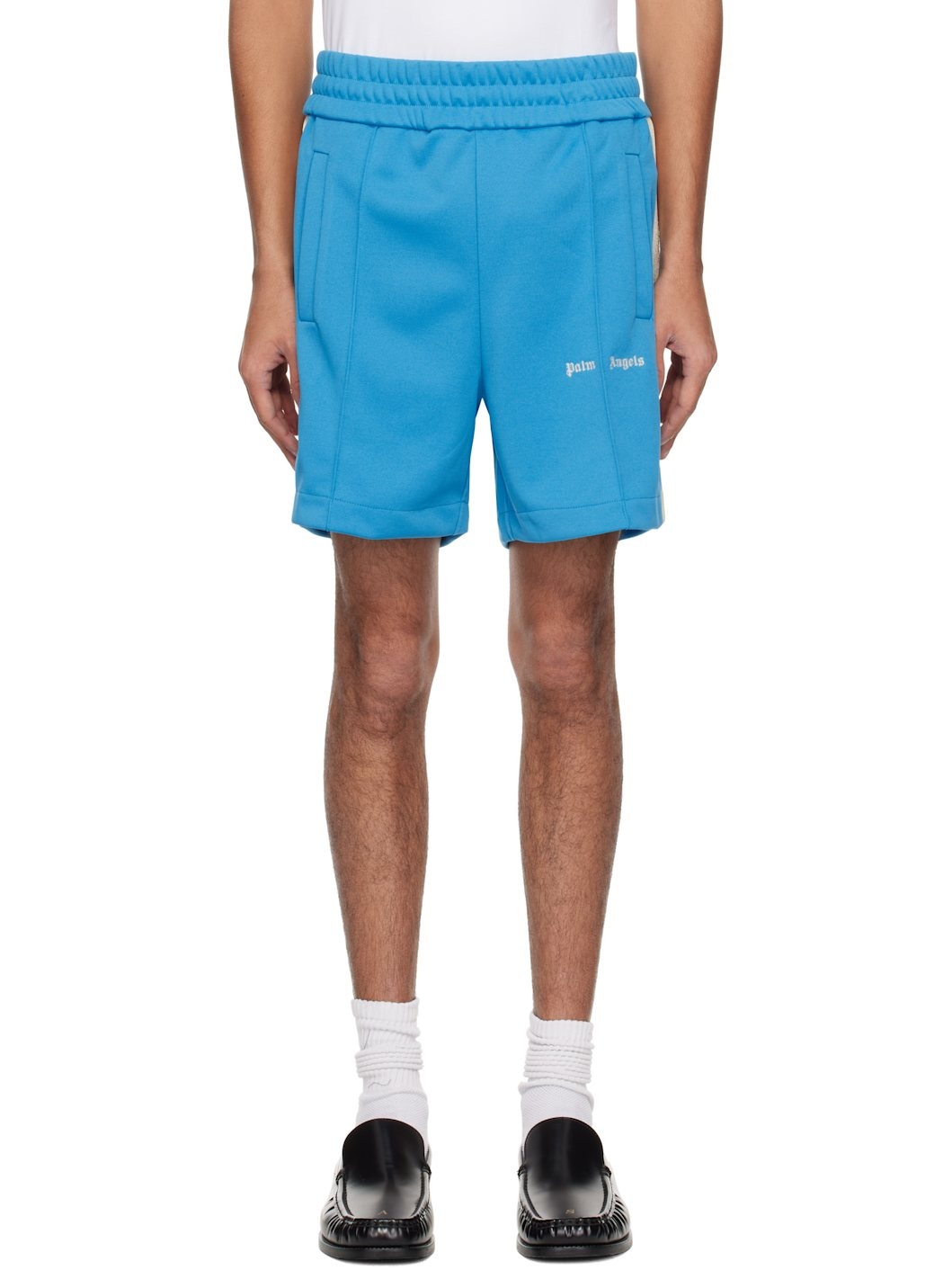 Polyester jersey shorts. · Elasticized waistband · Two-pocket styling · Pinched seam at legs · Embroidered logo at leg · Striped trim at outseams Supplier color: Light blue/Off white 100% polyester. Made in Portugal 251695M193017